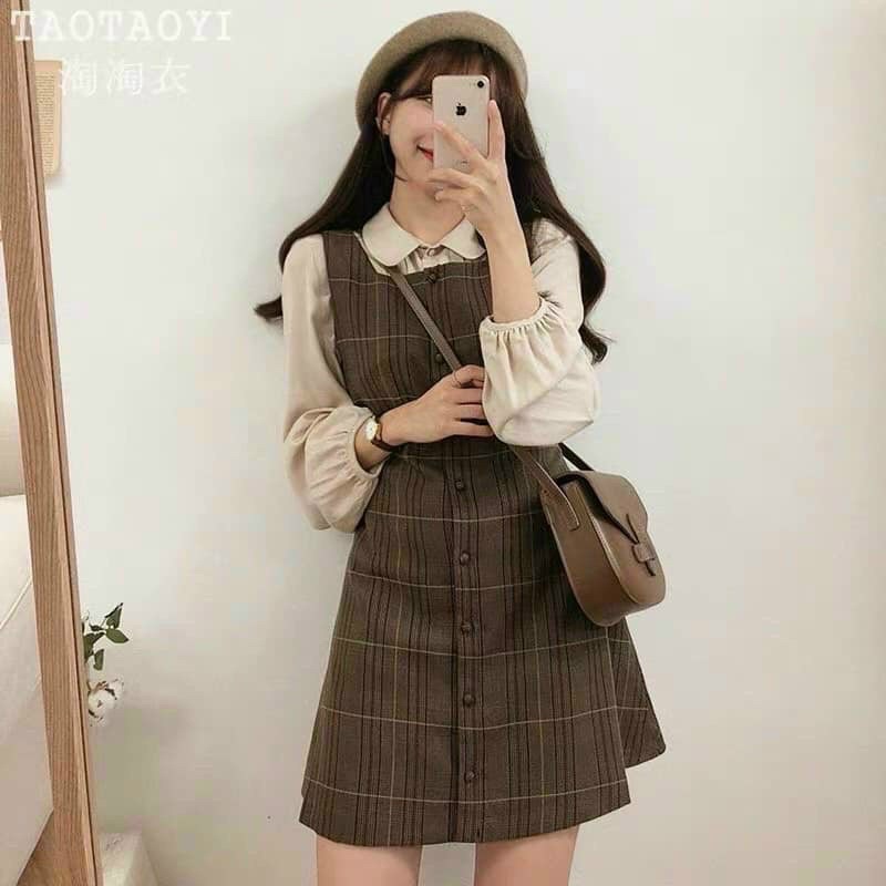 Thời Trang Nữ > Đồ liền thân > Quần yếm || SET SƠ MI CỔ SEN TAY PHỒNG + YẾM CARO
