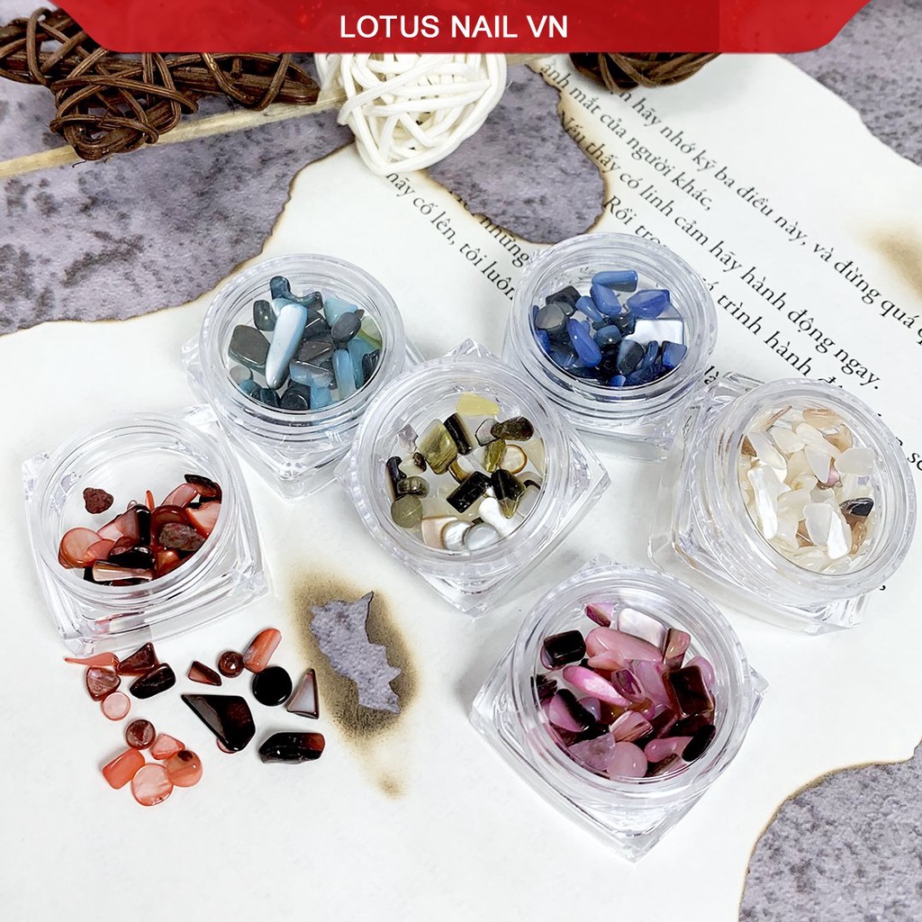- Sỏi vân đá là một trong những phụ kiện trang trí không thể thiếu trong ngành nail, được ưa chuộng tại các nước Hàn Nhật, là style quốc dân hiện nay các tiệm nail luôn hướng đến - Đính đá xà cừ sỏi thường được các thợ Nail sử dụng cùng phương pháp đắp ẩn gel, ẩn bột hoặc gắn móng giả - Xà cừ sỏi đủ các loại và kích thước khác nhau. Các thợ nail chỉ cần bỏ ra 1 chi phí nhỏ nhưng có được rất nhiều item để dễ dàng gắn lên móng, thỏa sức sáng tạo trong quá trình trang trí - Dùng kèm gel đính đá, gel đắp, keo bê tông để đạt hiệu quả.