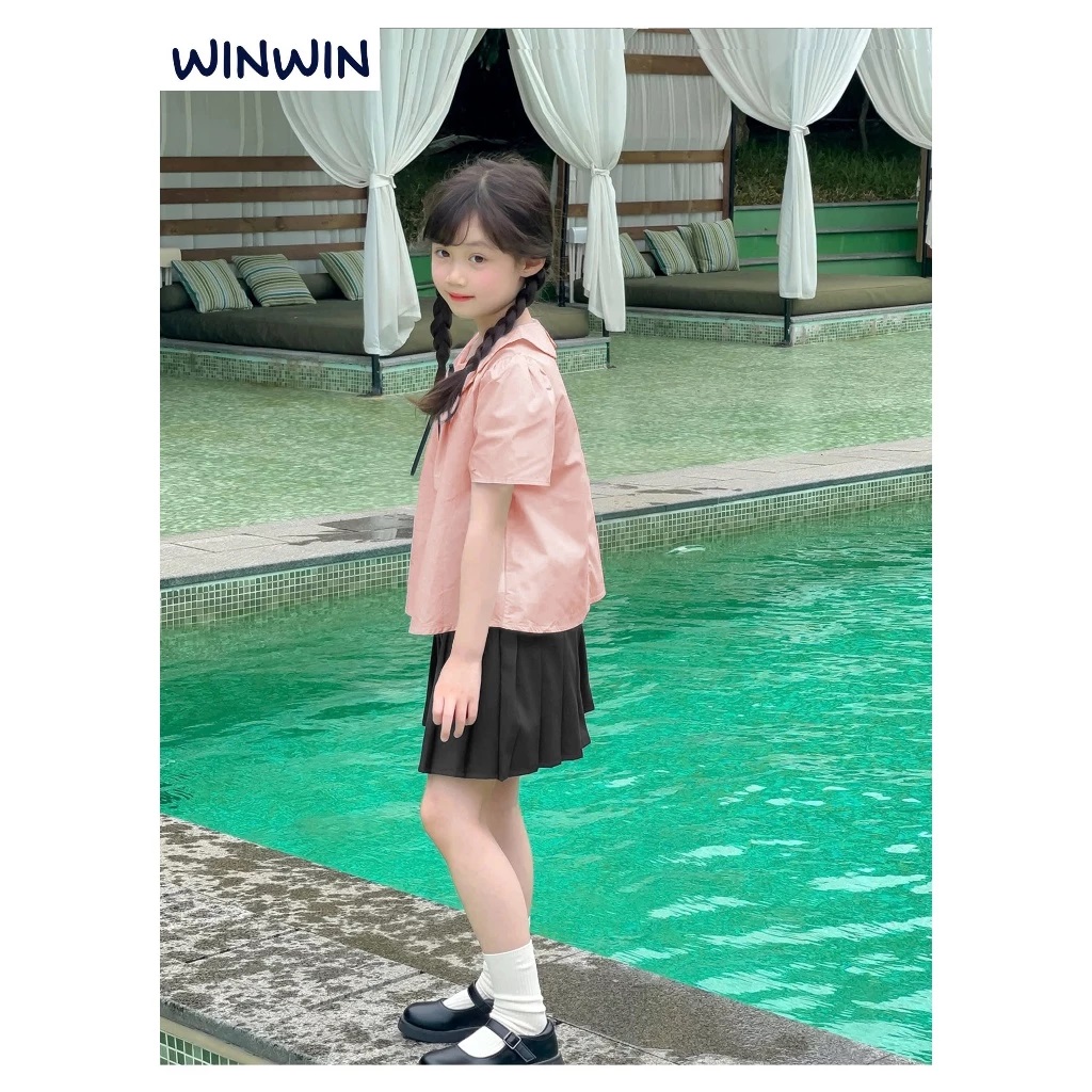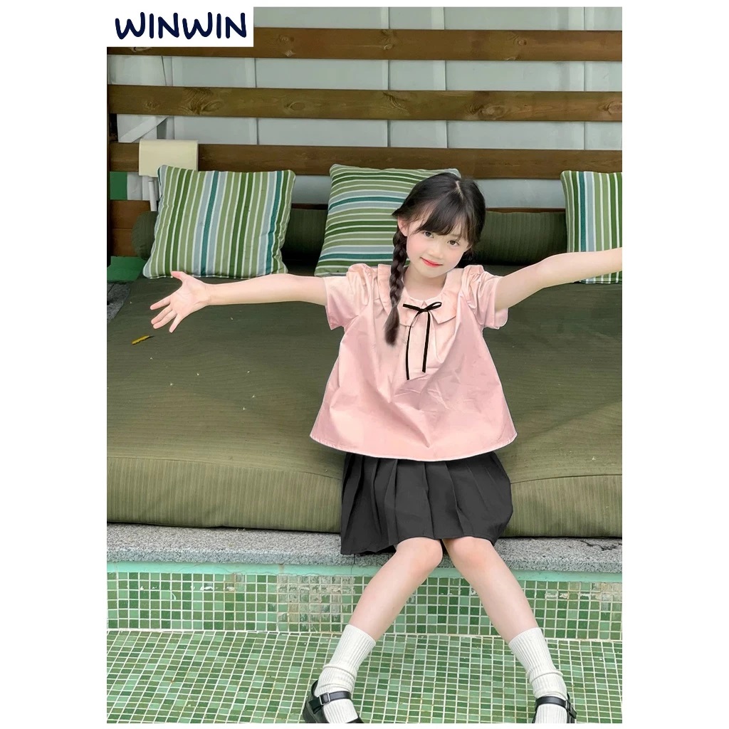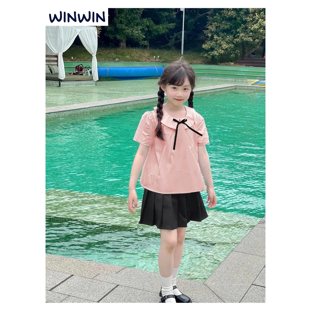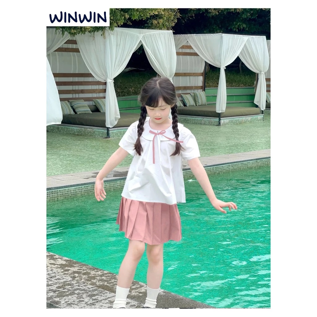 Set Váy Bé Gái, Bộ Bé Gái Phong Cách Học Sinh Áo Kate Cổ Sen Đính Nơ Kèm Chân Váy Xếp Ly Từ 12-45kg Dành Cho Bé Gái