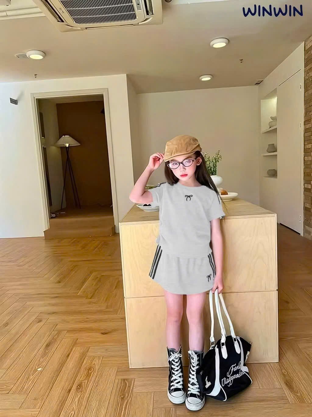 1. Tên sản phẩm : Set Váy Thun Thể Thao Bé Gái Ngắn Tay Viền Sọc In Nơ Từ 12-45kg Cho Bé Gái