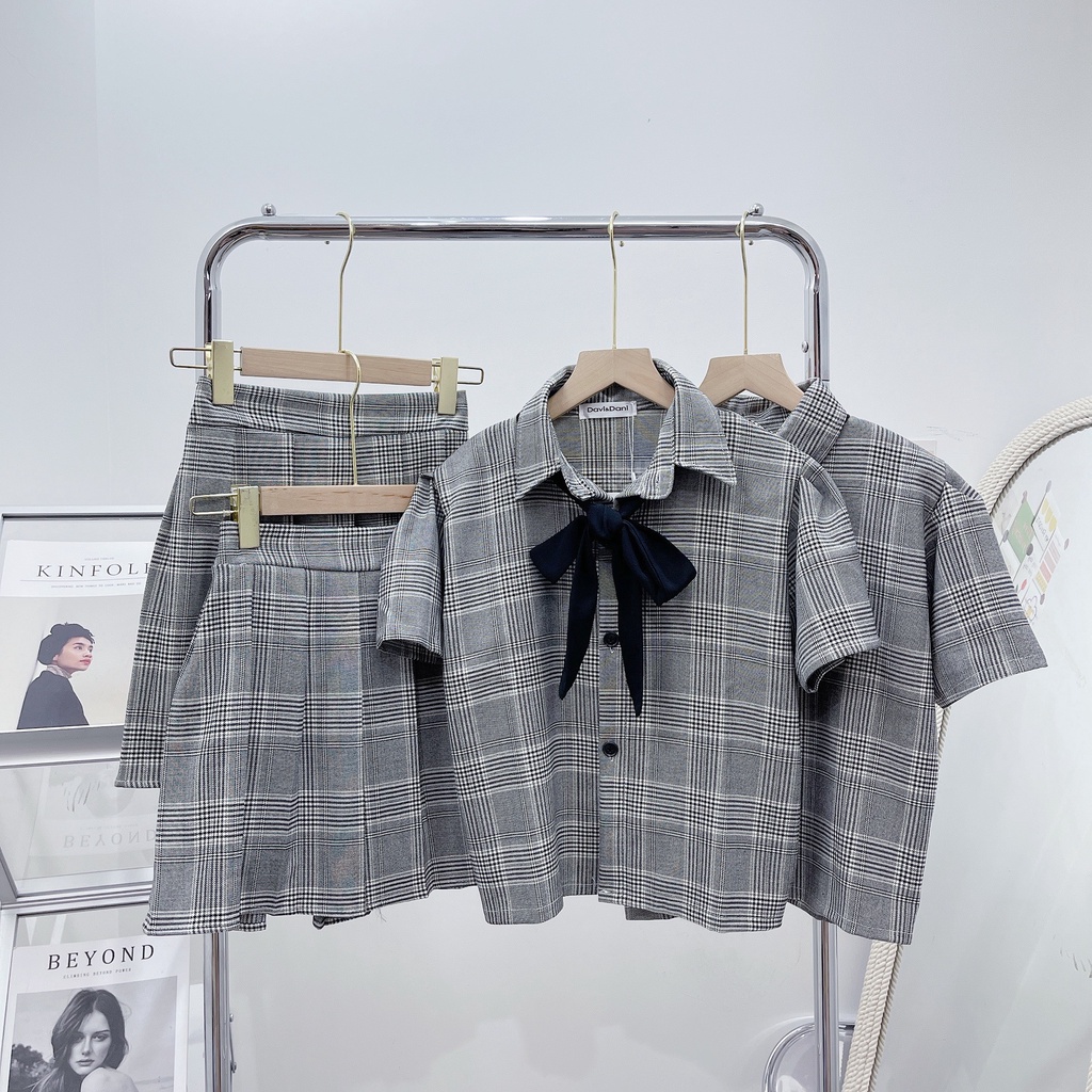 Giới thiệu Set vest nơ kẻ chân váy xếp li xám TL349