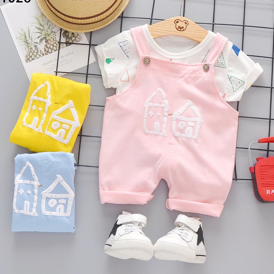 Thời trang trẻ em & trẻ sơ sinh > Quần áo bé gái > Com lê & đồ bộ || Set Yếm Bé Gái In Họa Tiết Ngôi Nhà Kèm Áo Thun Cotton Cho Bé Size 0 - 4 Tuổi MINTSCLOSET Mint's Closet - S1026