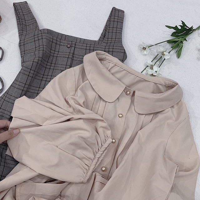 Set váy yếm caro xám kute phô mai que xinh xinh mặc chẻ đi chục tuổi là đây chứ đâu, dạng yếm xinh xắn, phối áo sơ mi tay dài, tách rời mặc cũng lợi lắm lắm lun🥰🥰