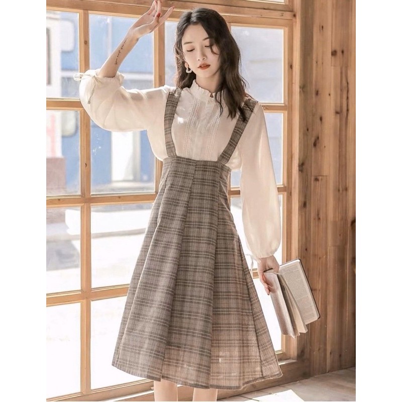 SET YẾM CARO ĐAN DÂY LƯNG + ÁO SƠ MI CỔ BÈO TAY BỒNG (S230)
