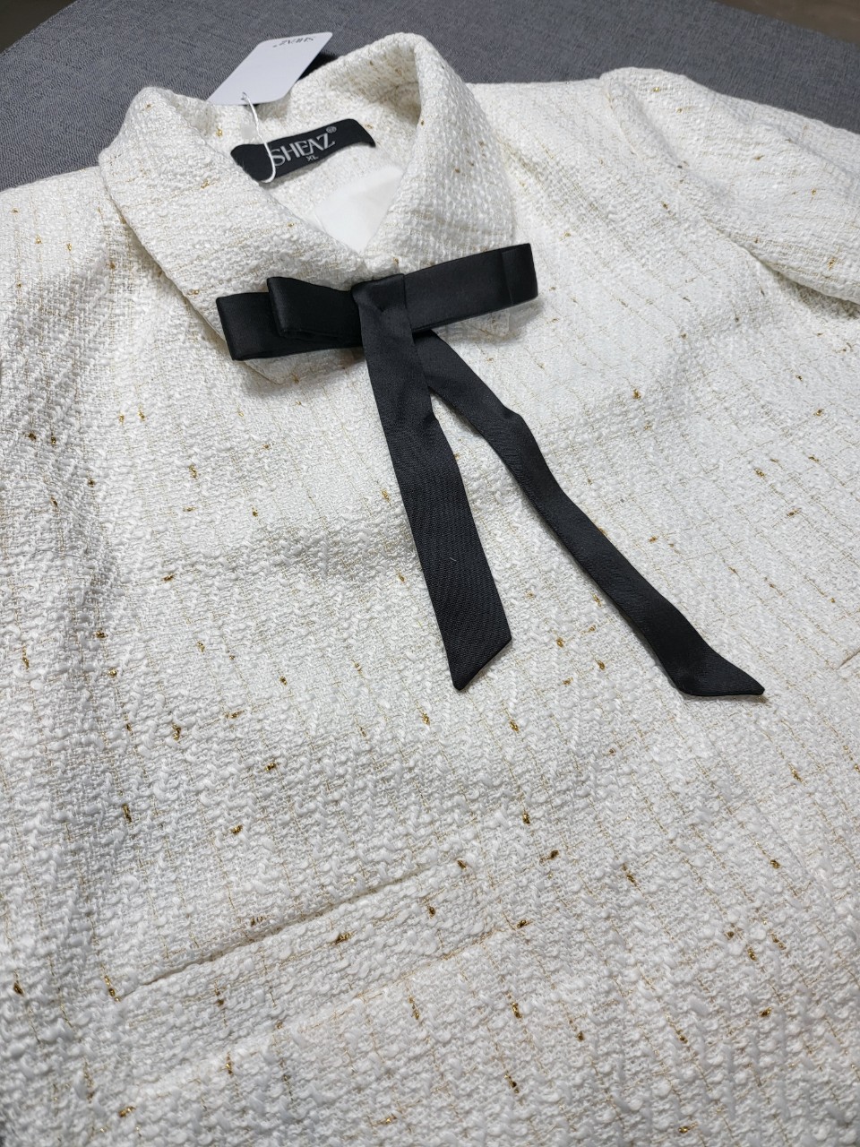 Chiếc áo khoác vest lửng trắng là 1 item classic có thể dùng trong mọi sự kiện từ công sở, tiệc, đến mặc casual dạo phố. Áo dài 48cm (size S), sử dụng chất liệu tweed trắng nhẹ nhàng điểm tô bằng những phẩy nhũ vàng. Cổ áo được đính nơ đen nhẹ nhàng. Áo sử dụng cúc bấm giấu trong