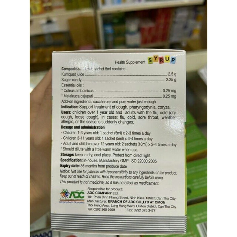 🍀 Thành phần: Mỗi gói 5 ml chứa: Dịch ép quả tắc (quất): 2,5 g Đường phèn: 2,25 g Tinh dầu tần dày lá (húng chanh): 0,25 mg Tinh dầu tràm: 0,25 mg