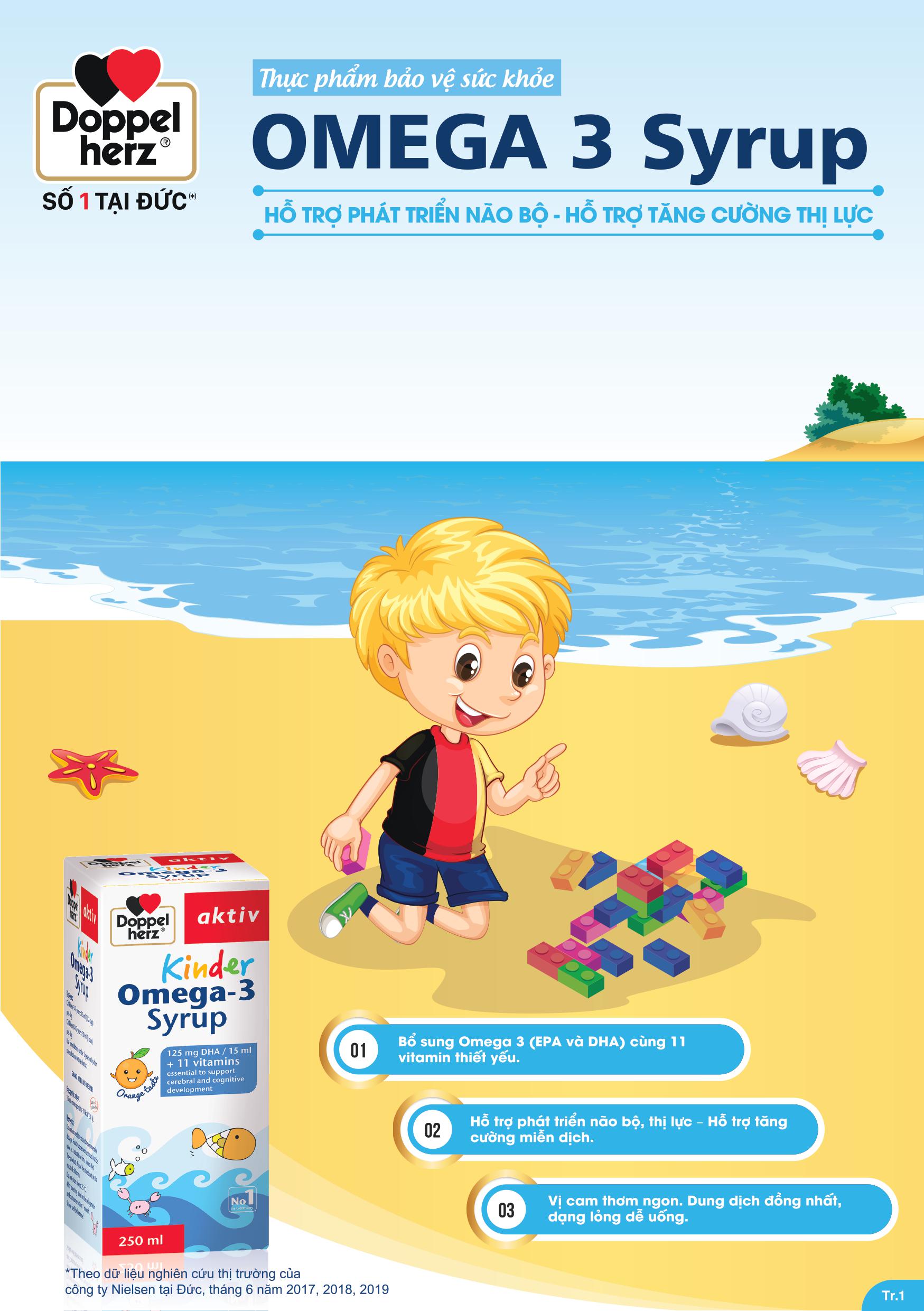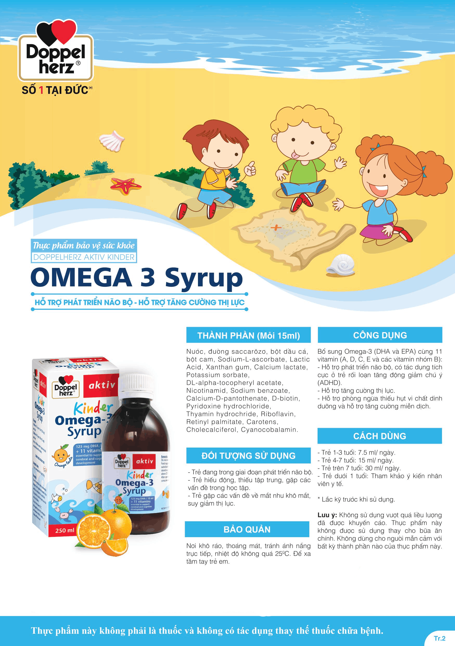 Kinder Omega-3 Syrup là sản phẩm từ Doppelherz - thương hiệu uy tín chiếm thị phần số 1 tại Đức, thuộc tập đoàn Queisser Pharma với lịch sử hơn 100 năm phát triển, được 98% người Đức biết đến, phân phối tại hơn 70 quốc gia trên thế giới với hơn 800 loại sản phẩm. Kinder Omega- 3 Syrup là sản phẩm bổ sung omega -3 từ dầu cá biển khơi với hàm lượng vượt trội cùng 11 loại vitamin thiết yếu giúp tăng cường não bộ, thị lực, cải thiện tập trung và tăng cường khả năng miễn dịch của trẻ.