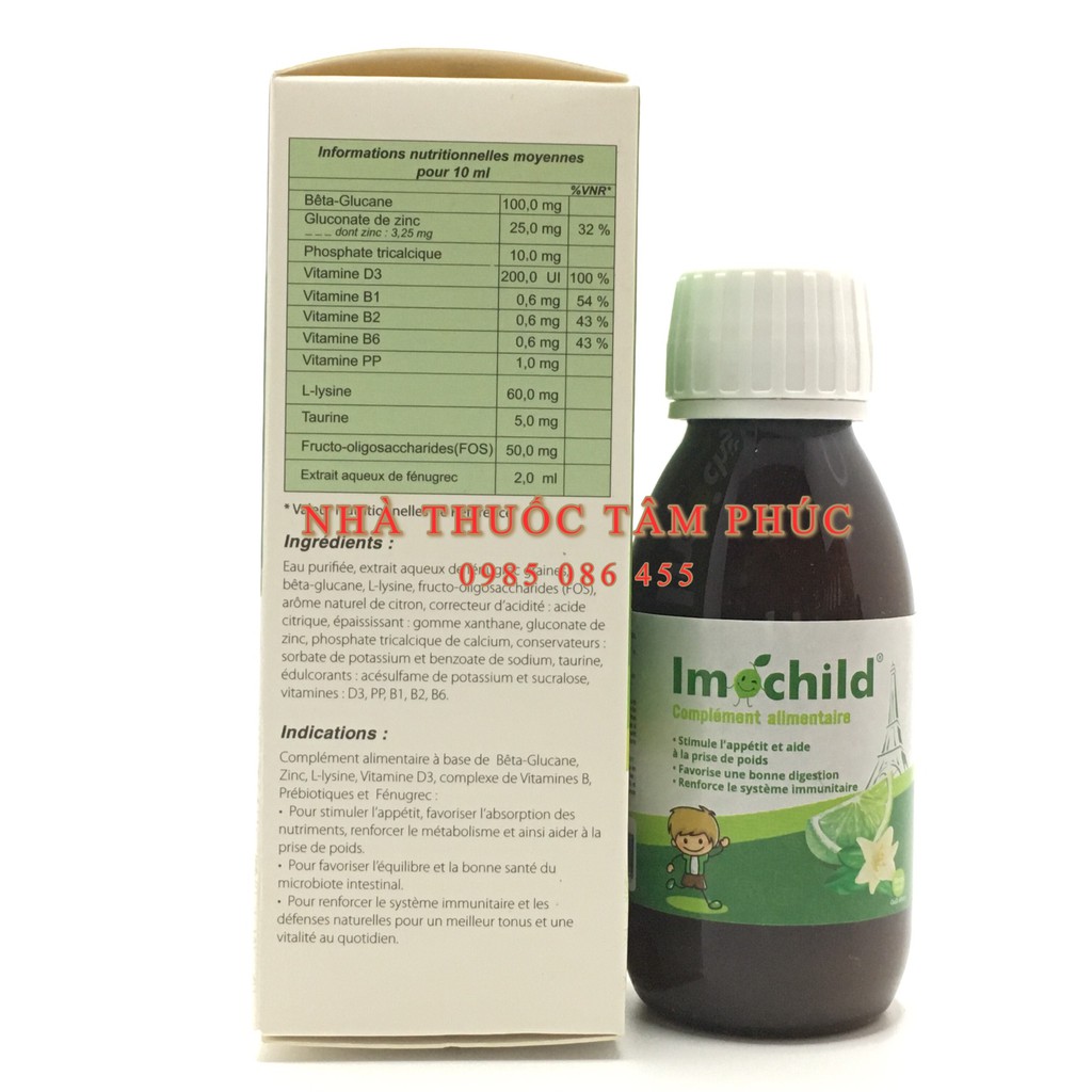 Thành Phần cho 10ml của Siro Imochild: - Beta-(1.3-1.6)-D-glucan............100mg - Kẽm Gluconate.......................... 25mg - Tricanxi phosphate......................10mg - Vitamin D3................................. 200UI - Vitamin B1..................................0,6mg - Vitamin B2................................. 0,6mg - Vitamin B6..................................0,6mg - Vitamin PP.....................................1mg - L-lysine........................................60mg - Taurine.......................................... 5mg - Fructo oligo saccharide............... 50mg - Dịch chiết cỏ cà ri........................... 2ml