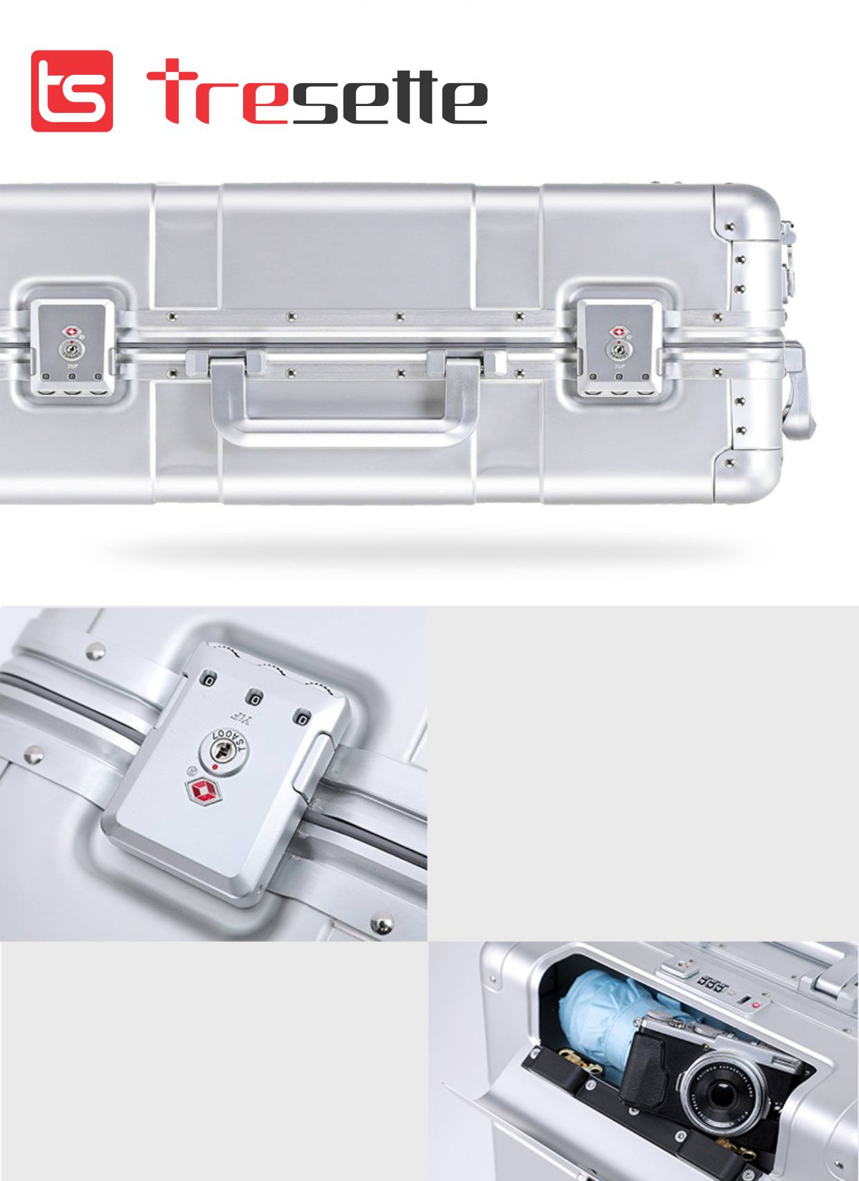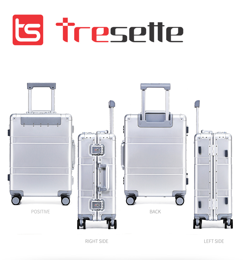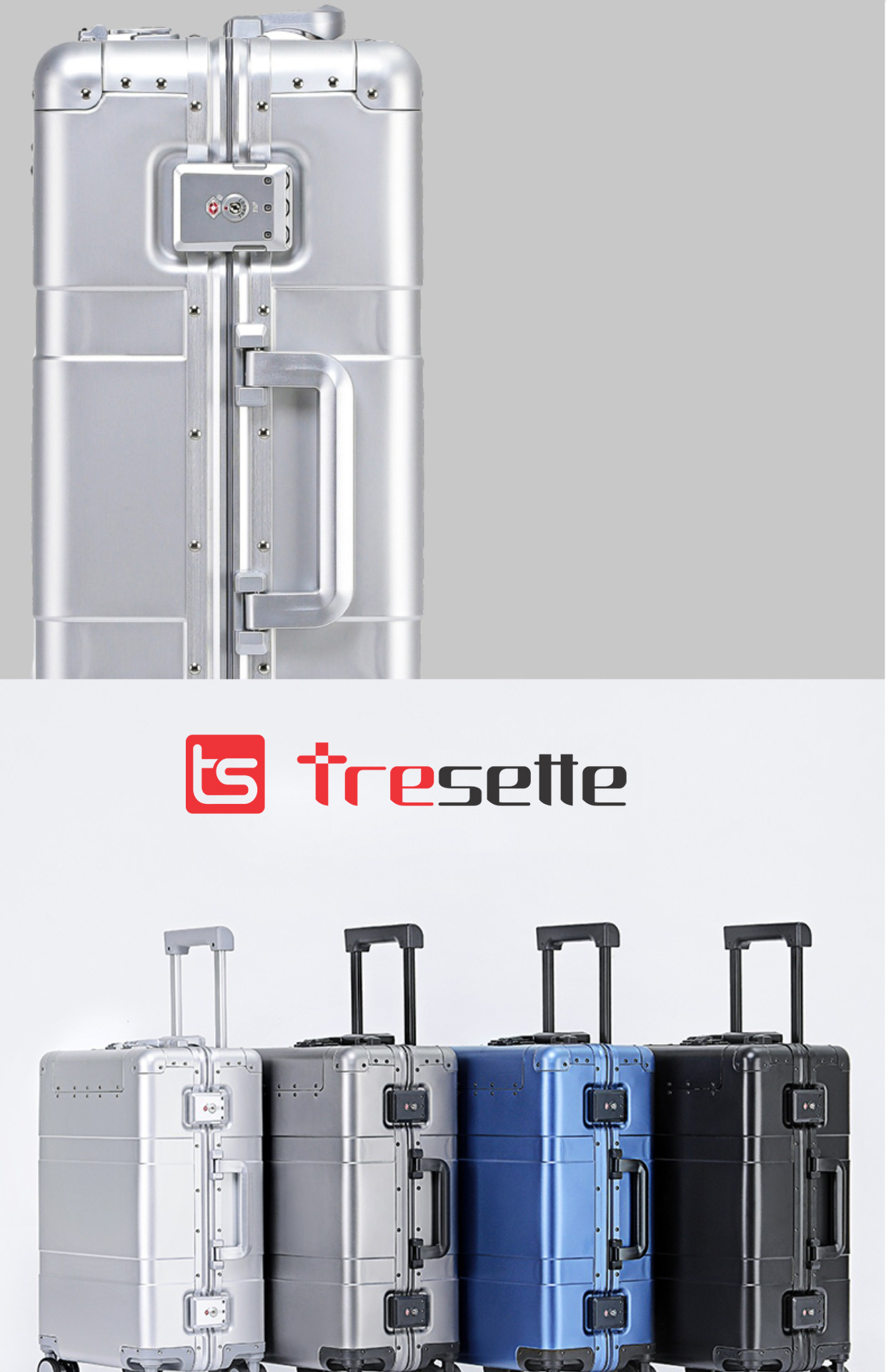 Toàn bộ thân vỏ vali Tresette làm bằng hợp kim nhôm Magie Làm cho vali rất nhẹ, độ đàn hồi cao, chống ăn mòn, chịu được tải trọng lớn