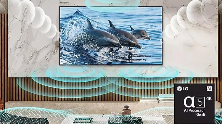 - Công nghệ AI Sound Pro mang đến trải nghiệm âm thanh như ở rạp chiếu phim mọi lúc nhờ bộ xử lý α5 Gen6 4K AI nâng cấp âm thanh 2 kênh lên dàn âm thanh ảo 5.1.2 kênh sống động.