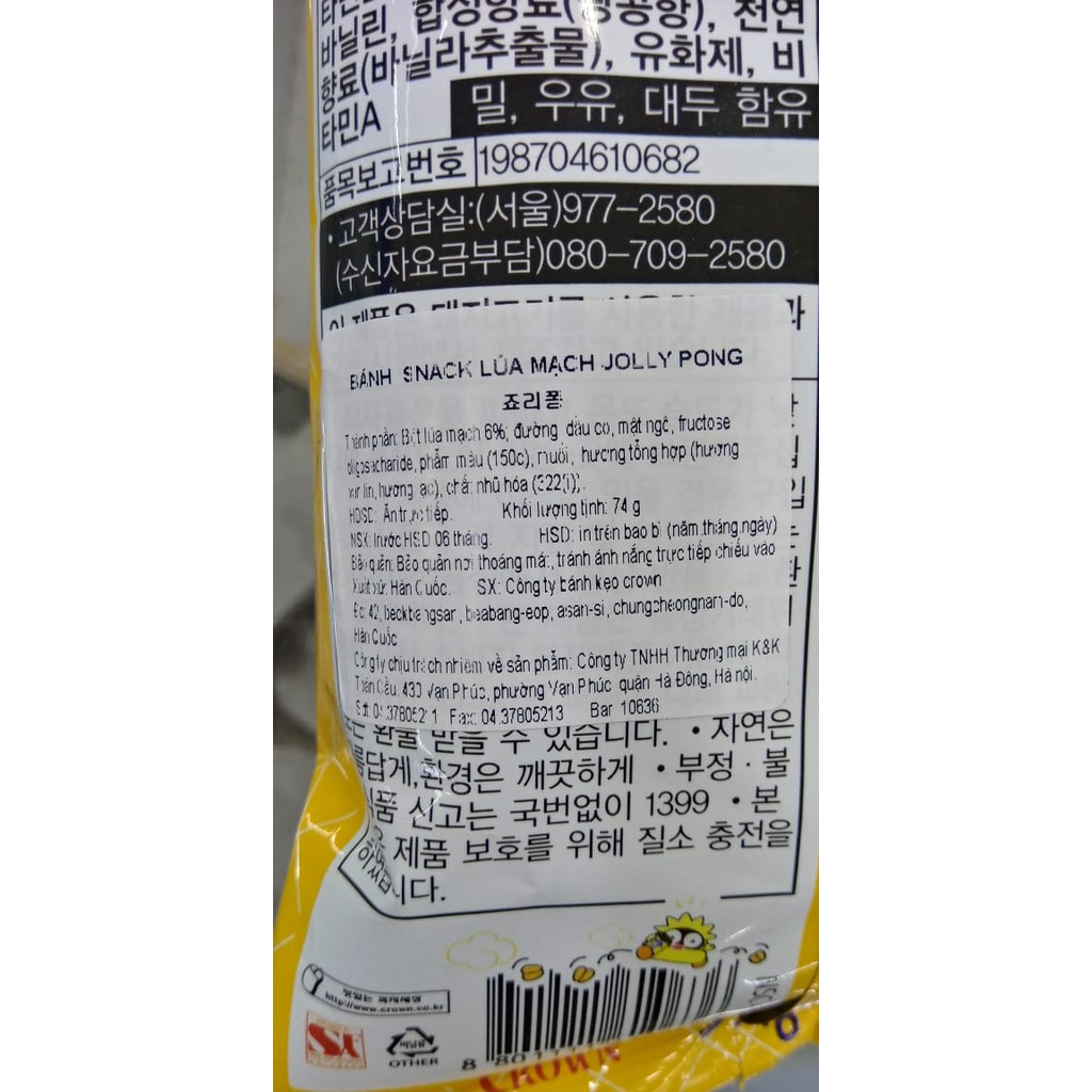 - Xuất xứ: Hàn Quốc - Thương hiêu : CROWN - Quy cách đóng gói: Túi 74g - Hạn sử dụng: 6 tháng - Thành phần: Lúa mạch, đường, dầu cọ, mật ngô, hương tổng hợp...... - Hướng dẫn sử dụng: Dùng trực tiếp - Hướng dẫn bảo quản: Bảo quản nơi khô ráo thoáng mát, tránh ánh nắng trực tiếp.