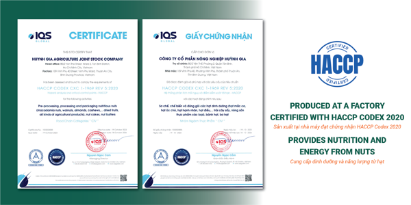 Sản phẩm hạt điều rang không muối Huỳnh Gia được sản xuất tại nhà máy đạt tiêu chuẩn chất lượng ISO, HACCP, HALAL.