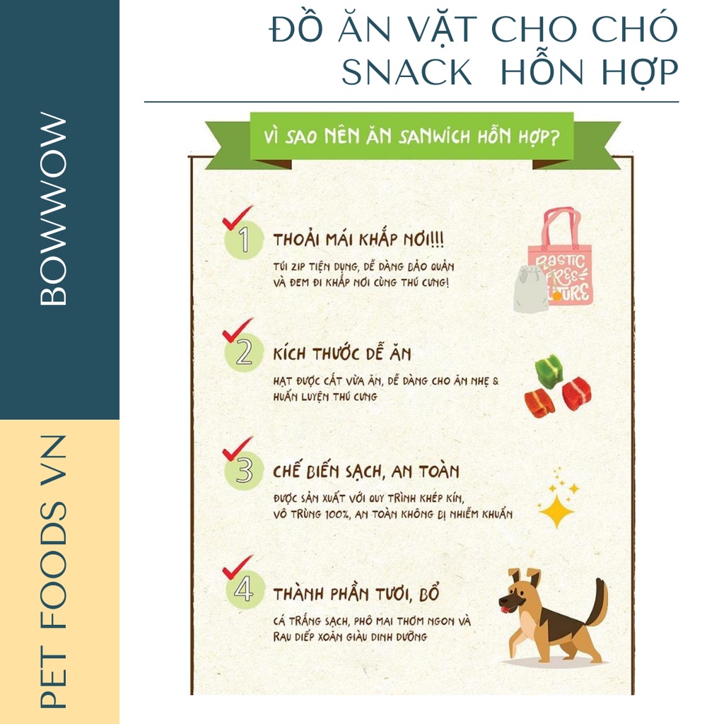 Snack hỗn hợp cho chó BOWWOW với thành phần chính là thịt gà và cá hồi, là món ăn nhẹ bổ dưỡng, giàu protein và khoáng chất dành cho các chú chó, giúp bổ sung dinh dưỡng thiết yếu cho chó con đang phát triển và chó mẹ biếng ăn sau khi sinh con