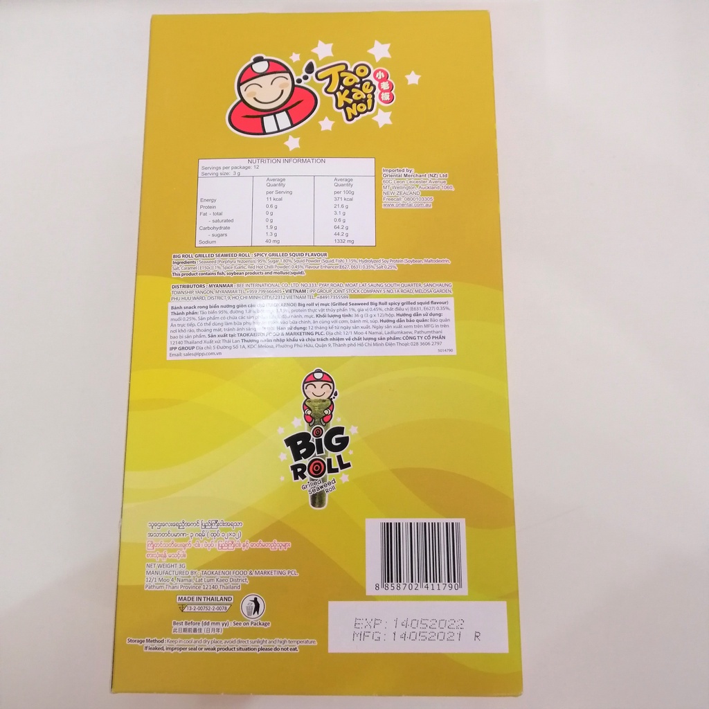 Snack Rong Biển Nướng Giòn Cậu Chủ TaoKaeNoi Big Roll được làm từ nguồn rong biển chọn lọc, có dạng thanh tròn vừa miệng, giòn tan hương vị thơm ngon, giàu chất dinh dưỡng sẽ là lựa chọn lí tưởng cho bữa phụ hay thêm vào bữa ăn chính, ăn cùng với cơm, bánh mì, súp Thành phần: Tảo biển, đường, bột mực, gia vị, protein thực vật thuỷ phân, sốt đậu nành len men, muối, chất điều vị Hướng dẫn sử dụng: Dùng trực tiếp Quy cách: 12 gói x 3g (Hộp 36g) Hạn sử dụng: 12 tháng Địa chỉ kho: 28/36/1 Lương Thế Vinh Phường Tân Thới Hòa Quận Tân Phú TP. Hồ Chí Minh Khách hàng mua sỉ liên hệ 0901 656 897 để được giá tốt