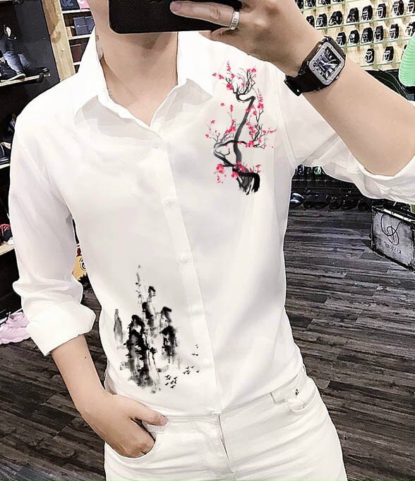 Thiết kế Sơ mi nam họa tiết núi non và hoa anh đào thời trang cao cấp phong cách đường may tỉ mỉ.
