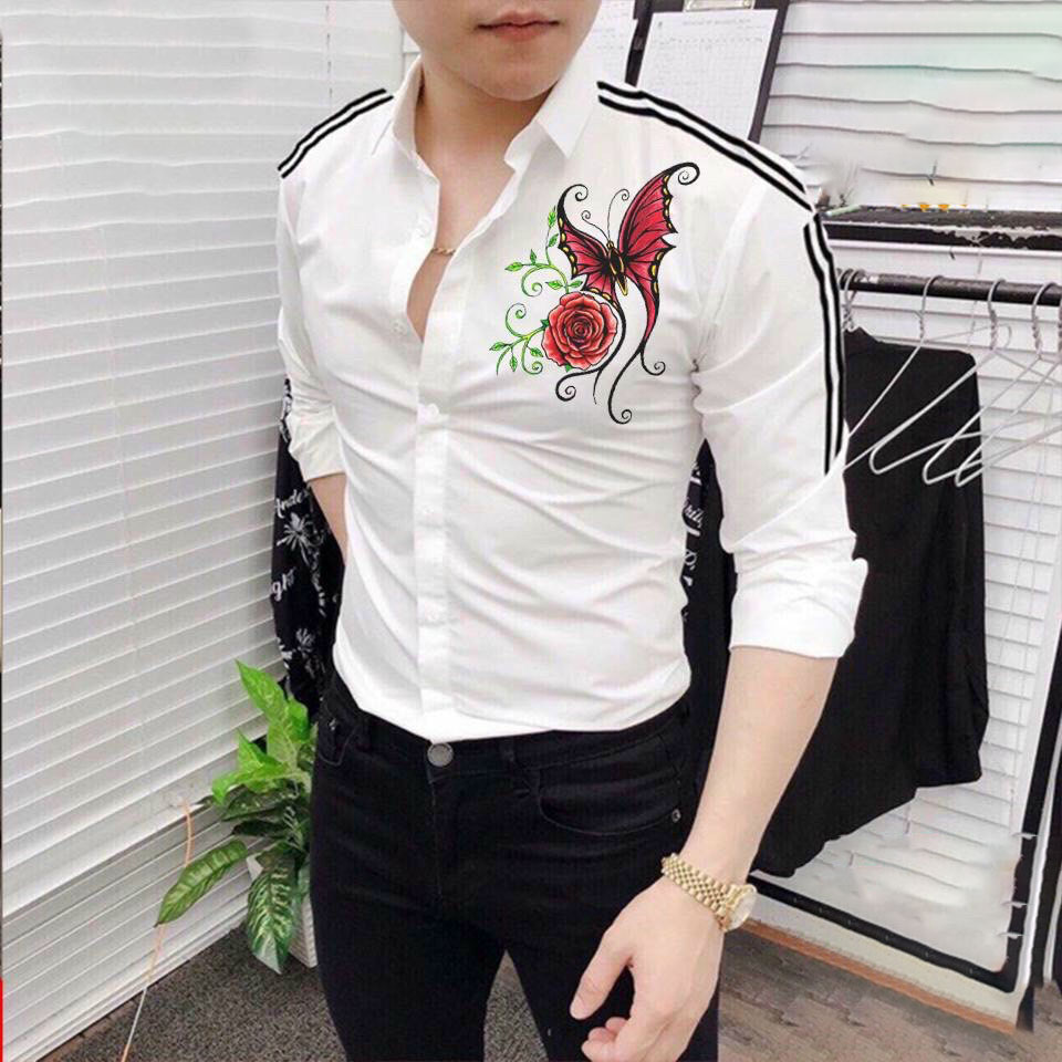 Thiết kế Sơ mi nam trắng viền vai hoa tiết bướm thời trang cao cấp phong cách đường may tỉ mỉ.
