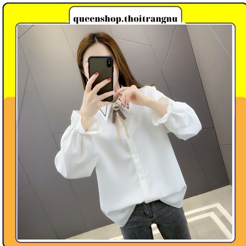Giới thiệu Sơ mi nữ cổ thêu viền tay bo chun kiểu dáng công sở chất vải đẹp không nhăn Queenshop