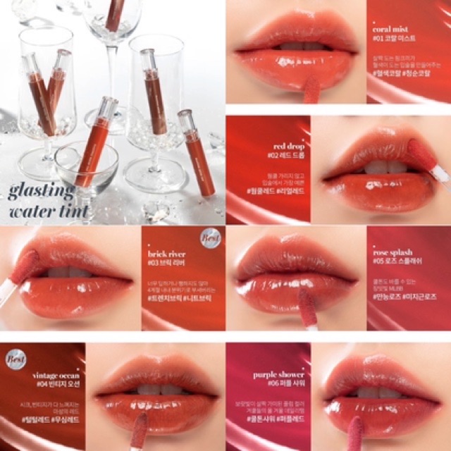 Romand Glasting Water Tint- dòng son tint hứa hẹn “lâu trôi bền màu” nhất trong các dòng sont tint 😝 . . 🍒Đúng như tên gọi, phiên bản mới chất tint bling bling hơn rất nhìu so với phiên bản cũ, mà đồ Romand thì nói thật mỗi bé nhà tớ ít nhất cũng có 1 màu giữ làm “bảo bối” luôn 🤧 chất son giữ màu siêu siêu đỉnh khi tớ có làm swatch lau thật sạch bằng khăn ướt cũng không thể hết đi làm base bên dưới >< quả thực quá ngạc nhiên về khả năng giữ màu em í . 🍓Packaging có phần chanh sả và đầm tay hơn phiên bản cũ. Bảng màu toàn màu mê ly quá toẹt cho mùa đông năm nay thuii . 🎁Cùng ngắm nghía 6 sắc mau đó là: #01 Coral Mist #02 Red Drop #03 Brick River #04 Vintage Ocean #05 Rose Splash #06 Purple Shower —
