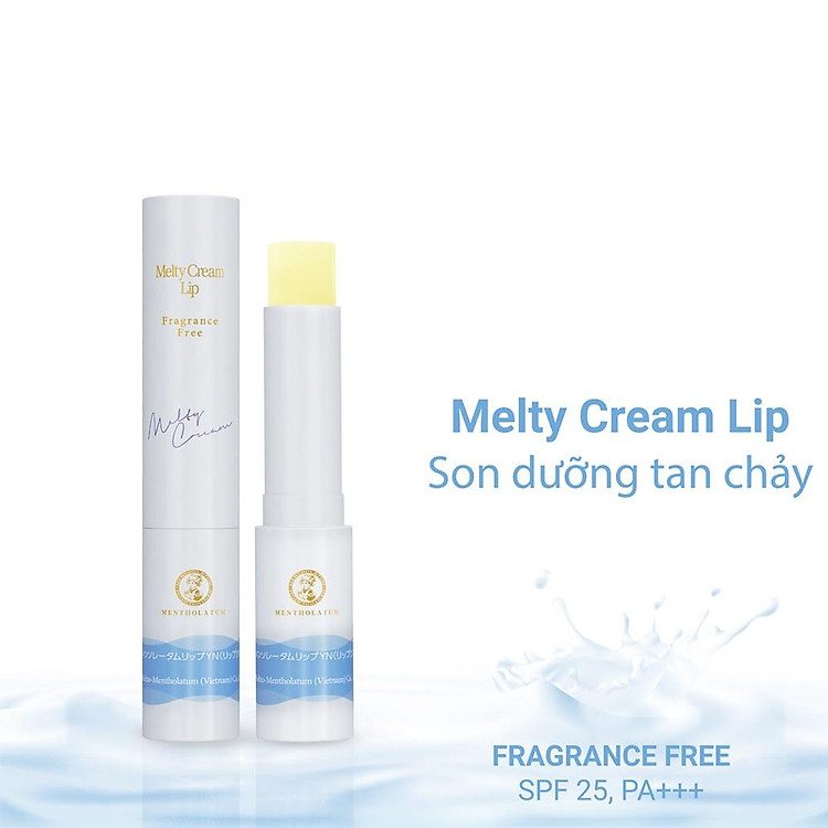 - Son Dưỡng Môi Mentholatum Melty Cream Lip Fragrance Free SPF25 PA++++ 2.4g với lớp kem son tự tan chảy sẽ phản ứng với nước từ không khí tạo thành lớp màng giữ ẩm độc đáo.