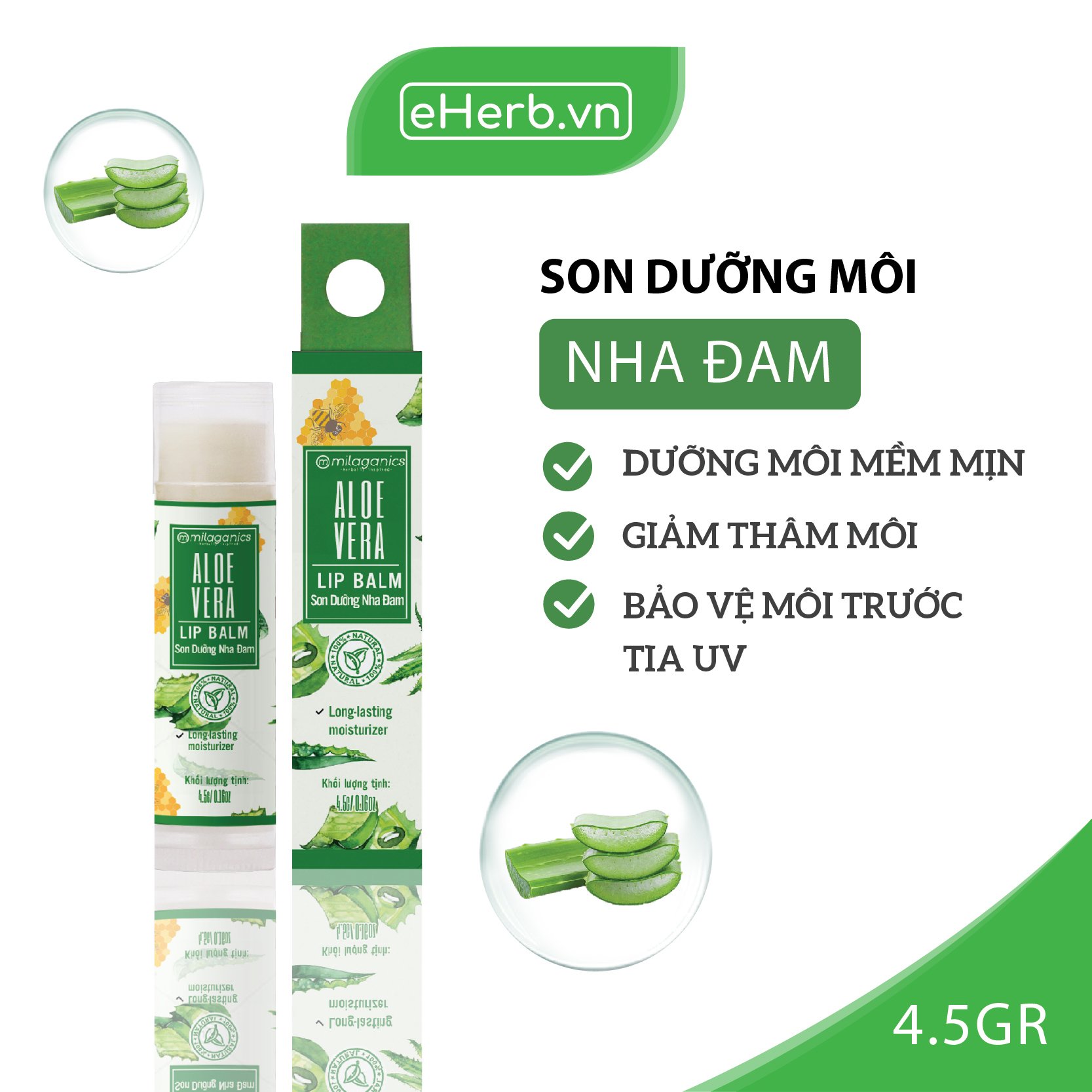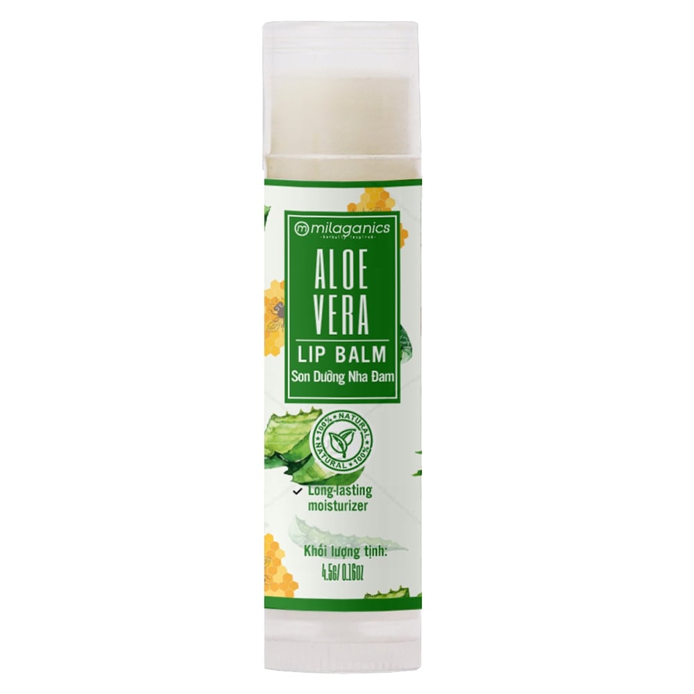 - Dưỡng môi hiệu quả mà không gây cảm giác bóng nhờn hoặc bết dính: Bơ Hạt Mỡ và Sáp ong trong son dưỡng nha đam giúp đôi môi được dưỡng ẩm và làm đầy rãnh môi mà không gây bóng nhờn hay bết dính.