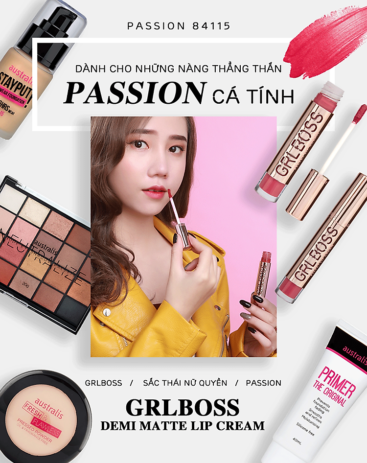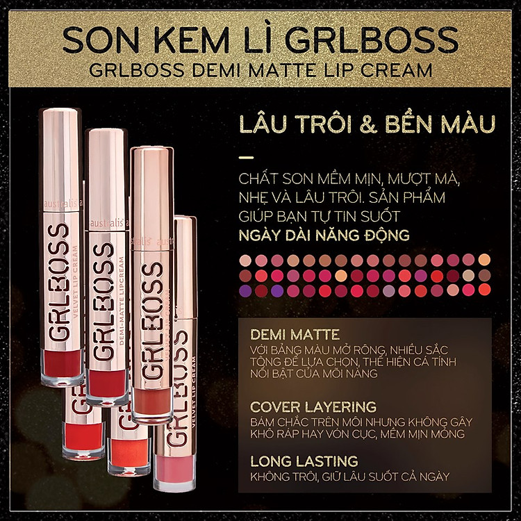 GRLBOSS Lips - Son kem lì GRLBOSS của austrlis sở hữu chất son mềm mịn, mượt mà, nhẹ và lâu trôi. Sản phẩm thời thượng này giúp nụ cười bạn luôn tự tin tỏa sáng suốt ngày dài năng động.