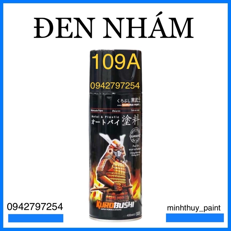 1.MÔ TẢ SẢN PHẨM CHAI SƠN MÀU ĐEN NHÁM 109A Sơn xe máy SAMURAI PAINT – Chống rạn nứt, kháng xăng Thương hiệu: Samurai Paint Công nghệ Nhật Bản Sản xuất: Malaysia Mã màu: 109A Màu sắc: Đen Nhám Dung tích: 400ml Thời gian sử dụng: 60 tháng kể từ ngày sản xuất được ghi trên vỏ chai 2.Quy trình sơn Samurai màu đen nhám 109A Bước 1: Chà nhám sạch sẽ với giấy nhám P800 (không cần chà hết lớp sơn cũ chỉ cần chà thật mịn ) Bước 2 : Sơn 2 – 3 lớp mỏng lót 2K04 hoặc UCH210, mỗi lớp cách nhau 10 phút (hoặc lâu hơn tùy vào điều kiện thời tiết) (2K04 đợi khô ít nhất 1 tiếng, đối với chai lót UCH210 đợi 25- 30p) Bước 3: (Nếu sử dụng lót 2K04) Sau khi lớp lót khô bạn chà nhám nhẹ nhàng lại một lần nữa và phơi khô Bước 4: Sơn 2-3 lớp mỏng màu đen nhám 109A. Mỗi lớp cách nhau 10 phút (hoặc lâu hơn tùy vào điều kiện thời tiết) Bước 5: Xịt 4 lớp mỏng bóng 2K01 hoặc K1K. Mỗi lớp cách nhau 8 – 10 phút (hoặc lâu hơn tùy vào điều kiện thời tiết) 3.Lưu ý: Mỗi lớp cách nhau 10 phút (hoặc lâu hơn tùy vào điều kiện thời tiết) Khô bề mặt: 15 phút (sau mỗi lớp sơn cuối cùng của từng màu phải đợi bề mặt khô trong vòng ít nhất 15 phút trước khi sơn màu tiếp theo)