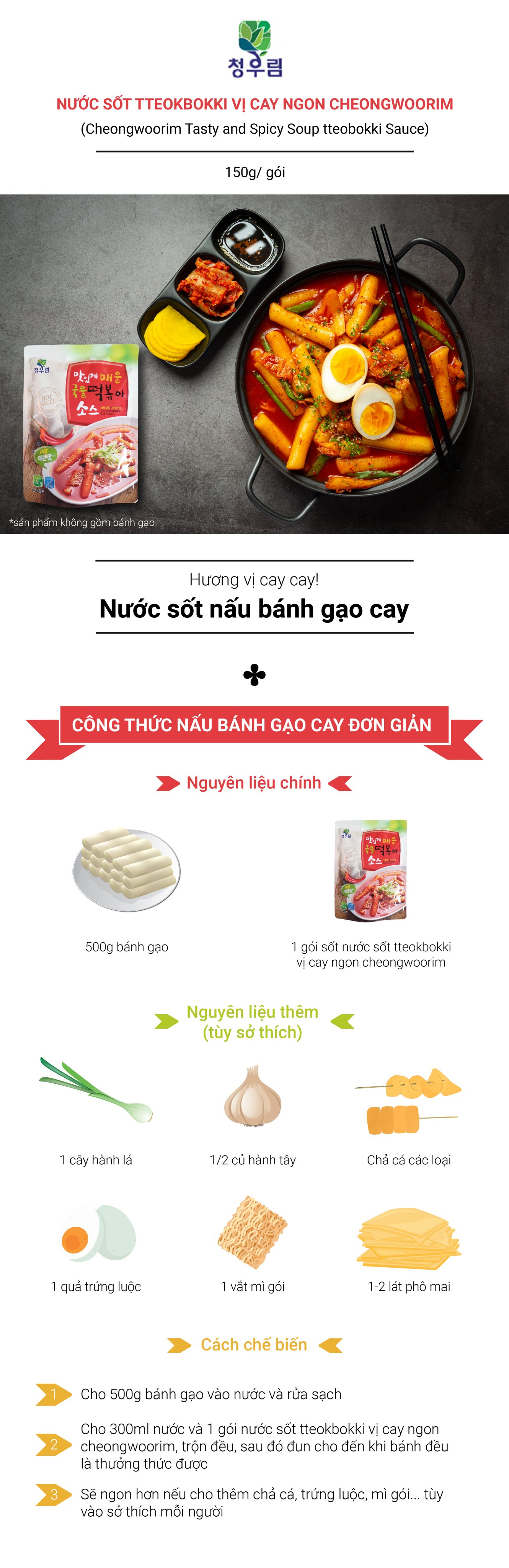 Hướng dẫn sử dụng | Cho 500g bánh Tteokbokki vào nước, rửa sạch,Cho 300 ml nước, 1 gói (150g) nước sốt tteokbokki vị cay ngon vào phần Tteokbokki đã chuẩn bị, trộn đều, sau đó đun cho đến khi bánh sôi đều là thưởng thức được,Sẽ ngon hơn khi cho thêm rau, chả cá, trứng luộc…vào tùy theo khẩu vị |