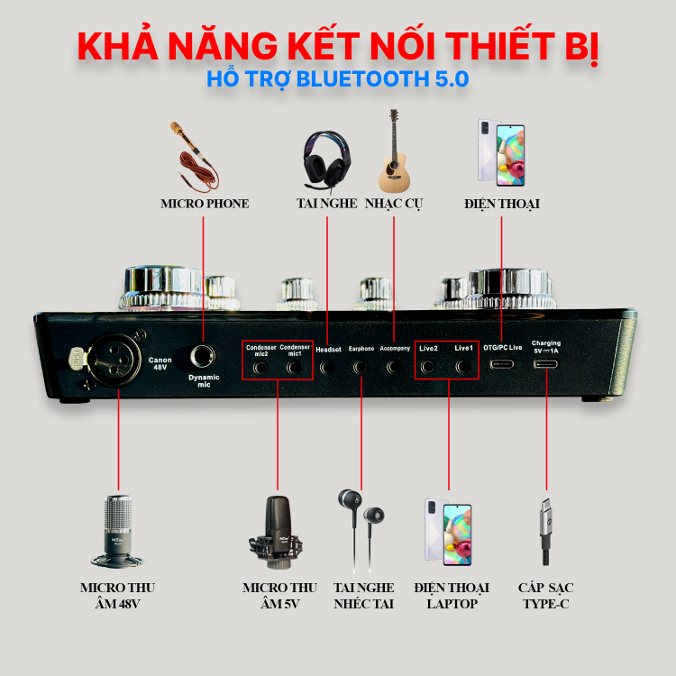 Sound card MTMAX X7 Pro tương thích với nhiều thiết bị âm thanh như điện thoại thông minh, máy tính xách tay, PC, máy tính bảng và còn có khả năng kết nối Bluetooth với điện thoại để nghe nhạc. Nó tương thích với nhiều dòng micro thu âm 5V và 48V phổ biến hiện nay, giúp bạn có thể tùy chỉnh và lựa chọn cho mình bộ sưu tập âm thanh cũng hoàn hảo.