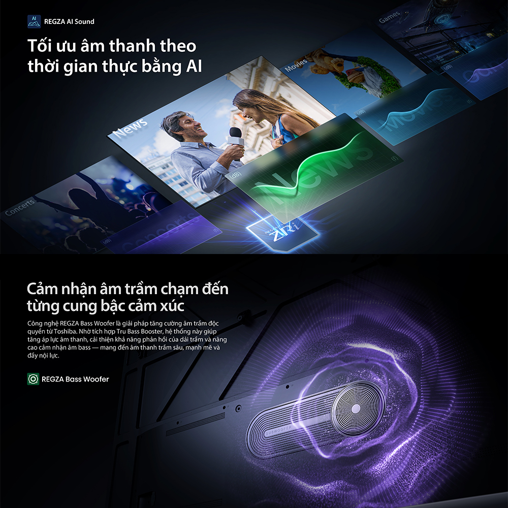 | Công nghệ âm thanh | Dolby Atmos, 360 Surround Upscaling, AI Natural Vocal Enhancer, Real Sound Adjuster, REGZA Bass Woofer |