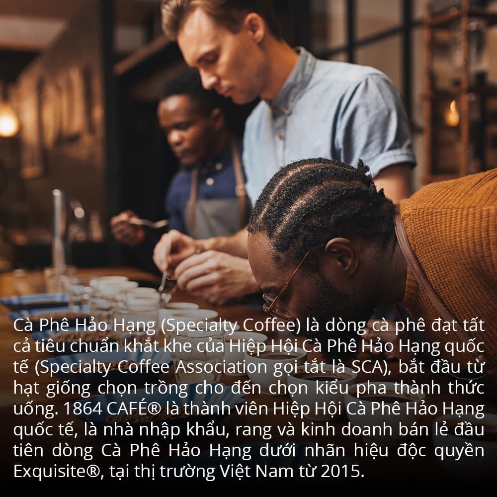 Thành phần | 100% Arabicachế biến ướt 100% giốngBourbon, Nhập khẩu và rang tại nhà máy 1864 CAFÉ, Việt Nam.Hương Sô cô la, Vani, tự nhiên. |