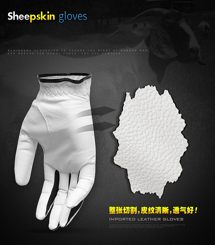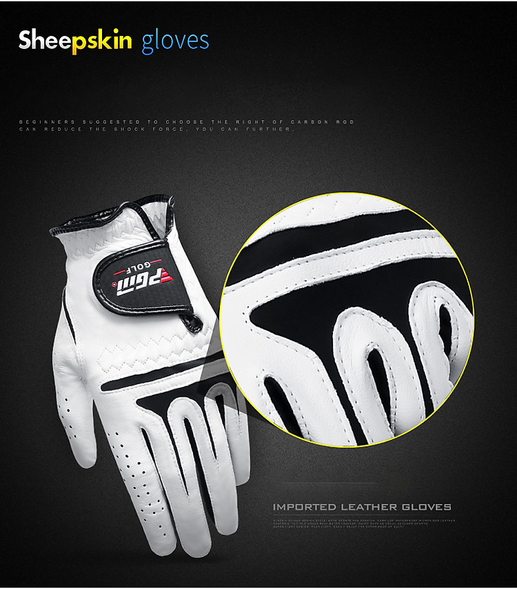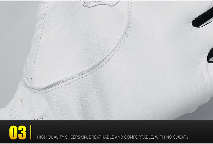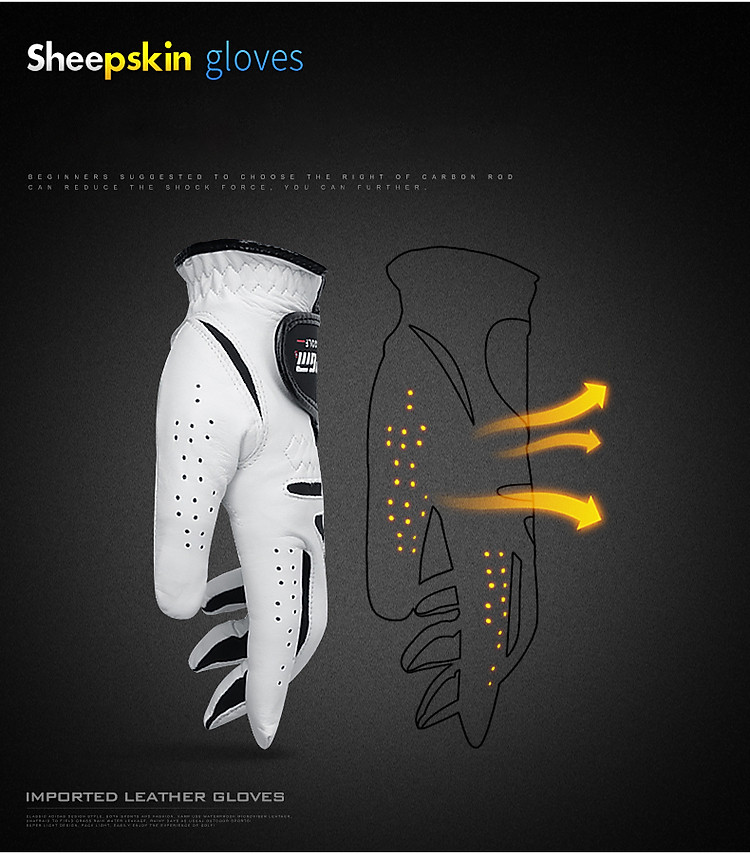 3. Tính năng - Ưu điểm của găng tay da cừu là mềm và tính thấm cao, lâu không thấm mồ hôi tay; - Lòng bàn tay đầy da cừu. Ưu điểm của toàn bộ da cừu là cảm giác tốt hơn, cử động ngón tay rất linh hoạt khi cầm. - Bảo vệ lòng bàn tay, giúp tránh trơn trượt, đảm bảo đánh golf đúng kỹ thuật. - Ngón giữa và ngón trỏ thiết kế một lỗ nhỏ, là để cải thiện chỉ số tính thấm và tính linh hoạt - Thiết kế cổ điển đẹp, mặt sau bằng da, rất mềm, thoáng khí, găng tay da đầy đủ để đáp ứng nhu cầu tương đối cao cho người chơi.