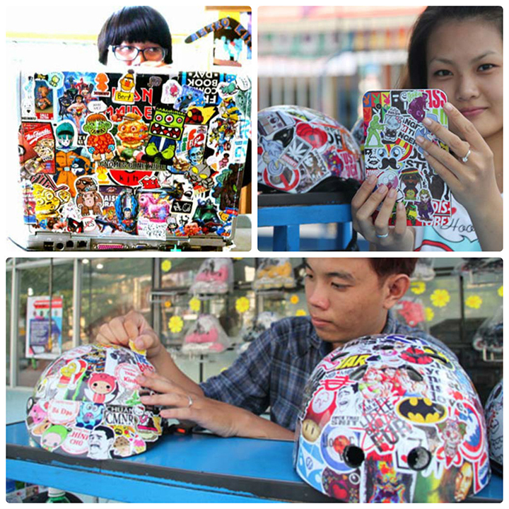 - Sticker còn gọi là decal, tem, hình dán dùng để trang trí lên tất cả bề mặt cứng: mũ bảo hiểm, laptop, xe đạp, xe máy, ô tô, vali, tường, cửa nhà, tủ lạnh, tủ quần á