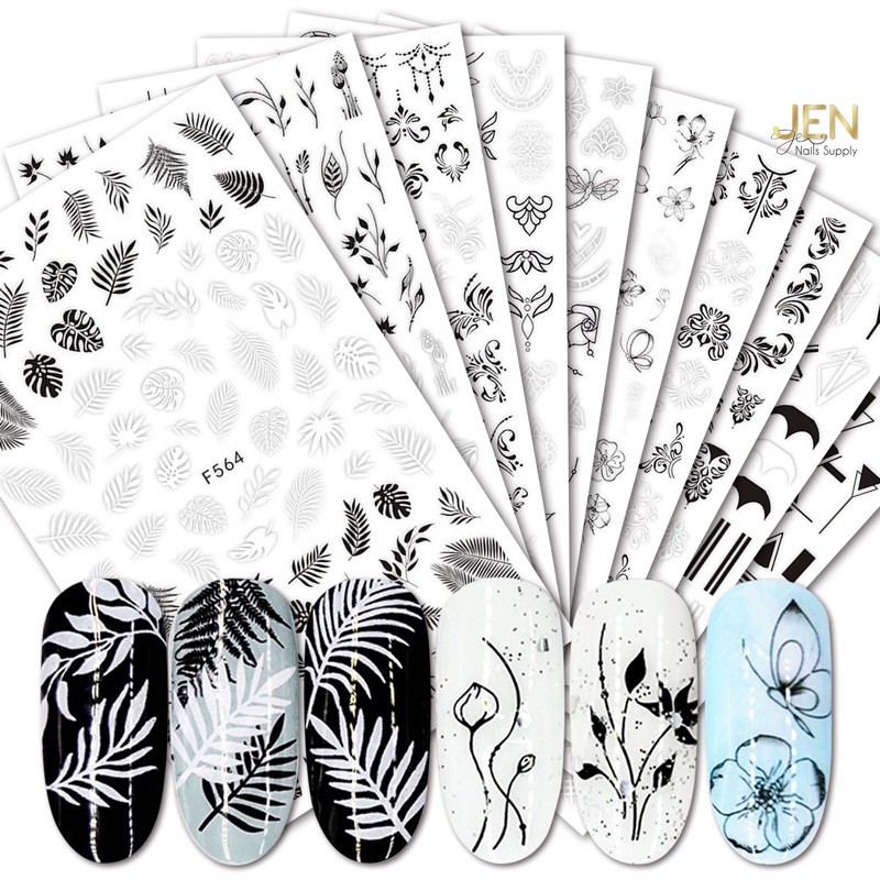 decal dán hoạ tiết hoa lá, hoa văn trắng và đen, chi tiết nét vẽ tinh sảo dán trực tiếp trên nền móng, giúp bộ móng design nhanh, gọn và đẹp..