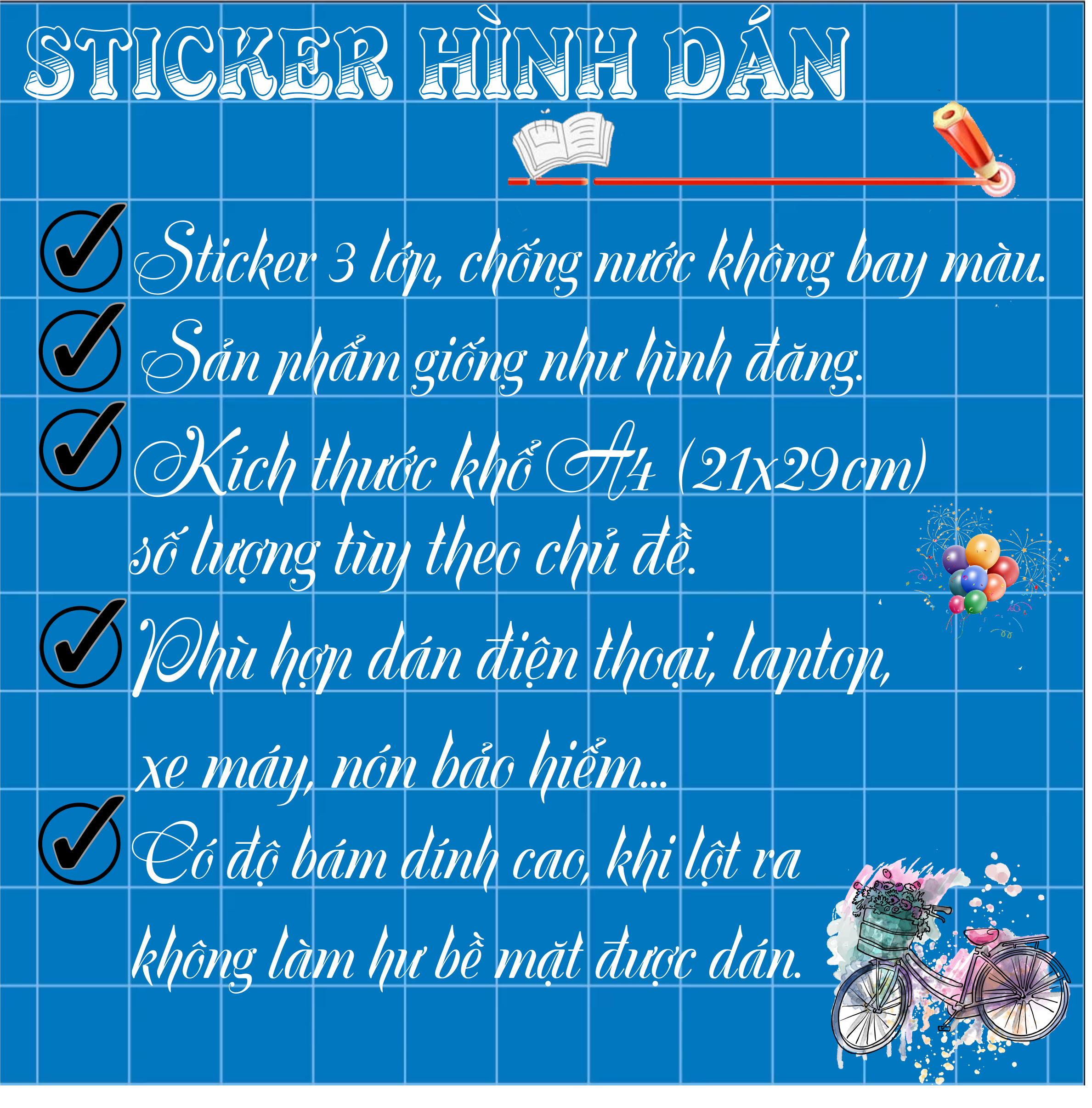 - Sticker hình dán, 3 lớp chống nước và không phai màu.