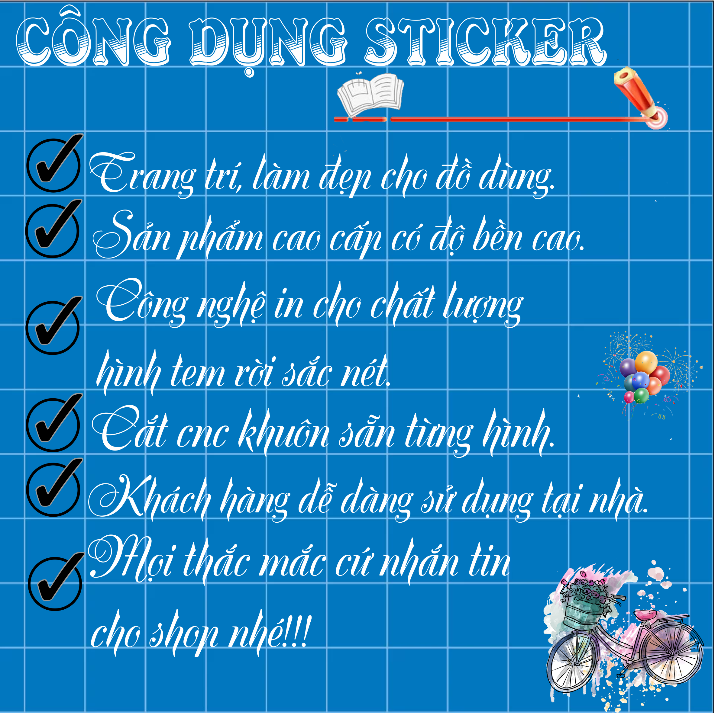- Sử dụng sticker tem hình dán dùng để dán trang trí nón bảo hiểm, xe, tủ lạnh, vali, tủ, tường, laptop, máy vi tính