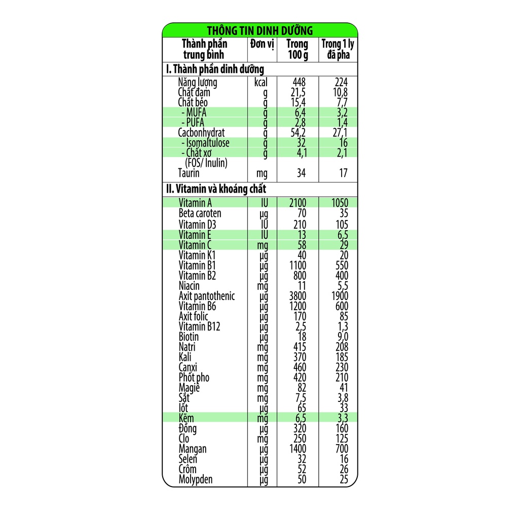 *THÔNG TIN SẢN PHẨM: - Chỉ số đường huyết (GI) = 31.5 (theo kết quả kiểm nghiệm lâm sàng do Trung tâm Dinh dưỡng thực hiện) & đạt mức thấp theo khuyến nghị của IDF (Hội đái tháo đường Hoa Kỳ) (chỉ số GI ≤ 55 được xem là thấp). - Isomaltulose: thành phần đường bột hấp thu chậm giúp ổn định đường huyết. - MUFA & PUFA: các axít béo không no giúp làm giảm cholesterol trong máu, kiểm soát huyết áp, hạn chế các bệnh về tim mạch liên quan đến bệnh lý mạch vành. - β-carotene, vitamin A, D: giúp tăng cường thị lực, giảm bớt các rủi ro bất lợi ảnh hưởng đến mắt do lão hóa và biến chứng về mắt do đái tháo đường gây ra. - Vitamin nhóm B, E, C, Zn: giúp tăng cường sức đề kháng, hạn chế các bệnh mắc phải do nhiễm khuẩn, cũng như giúp cơ thể đủ khỏe mạnh chống chọi với những biến chứng thường gặp của bệnh đái tháo đường. - FOS/ Inulin: có tác dụng làm chậm hấp thu đường vào máu, ngăn ngừa táo bón, hỗ trợ hệ đường ruột khỏe mạnh, giúp hấp thu tốt các dưỡng chất. - Diabet Care Gold sử dụng đạm có giá trị sinh học cao, đạt chỉ số hấp thu PDCAAS=100% (PDCAAS là phương pháp xác định chất lượng của đạm được WHO/FAO và FDA công nhận). - Sản phẩm không chứa Gluten và không Cholesterol.