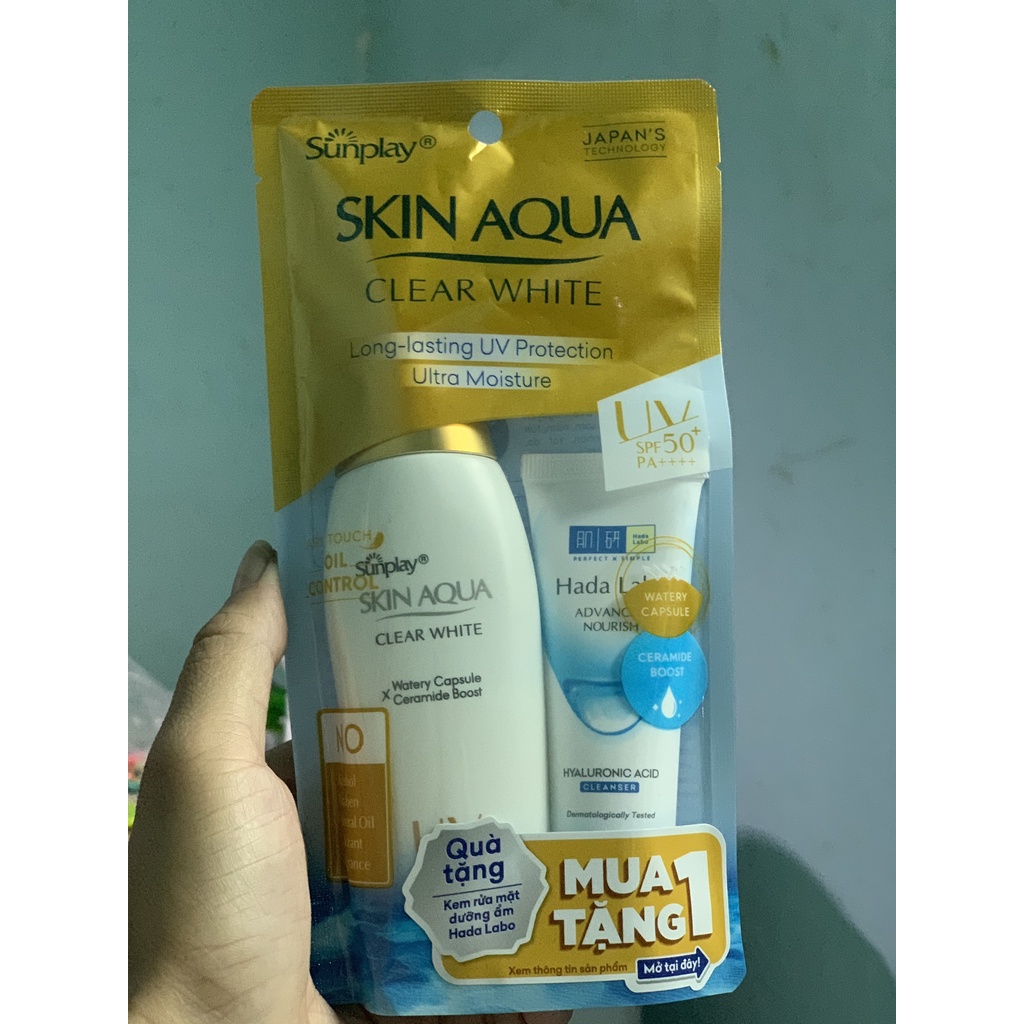 Chống nắng Sunplay Skin Aqua Tuýp: 25g, 55g Chống nắng hàng ngày là cách dưỡng da tốt nhất: Ánh nắng không chỉ làm da đen sạm mà còn lấy đi độ ẩm cần thiết trên da. Da thiếu ẩm càng dễ bị tổn thương hơn và sớm có những biểu hiện lão hóa, tàn nhang, nám da, đốm nâu,…Hàng ngày, bảo vệ da khỏi nắng từ bên ngoài đồng thời chăm sóc da từ bên trong giúp giữ gìn một làn da đẹp. MÀNG NƯỚC SKIN AQUA CHỐNG NẮNG DƯỠNG DA HIỆU QUẢ: Bảo vệ da hiệu quả khỏi tác hại của tia UV, tránh nguy cơ ung thư da: PA++++ tăng cường chống mọi loại tia UV (gây đen sạm, nám, tàn nhang, nếp nhăn, đốm nâu,…) SPF50+ ngăn tia UVB (gây rát da, cháy nắng,… ) Dưỡng da trắng mịn tối ưu: Hệ dưỡng ưu việt chứa Collagen, Hyaluronic Acid, Amino Acid dưỡng da săn chắc, ngừa lão hóa da sớm và lưu giữ độ ẩm tối đa. Dẫn xuất Vitamin C & B3 hàm lượng cao giúp làm mờ vùng da sạm màu, phục hồi các hư tổn da do nắng, cho hiệu quả dưỡng trắng mịn tối ưu. Cảm giác thoáng mịn nhẹ tênh: Dạng sữa thấm nhanh, không gây nhờn rít, thích hợp với mọi loại da. Khả năng chịu nước và mồ hôi cao. Thích hợp dùng làm lớp lót trang điểm. Lắc kỹ trước khi dùng.