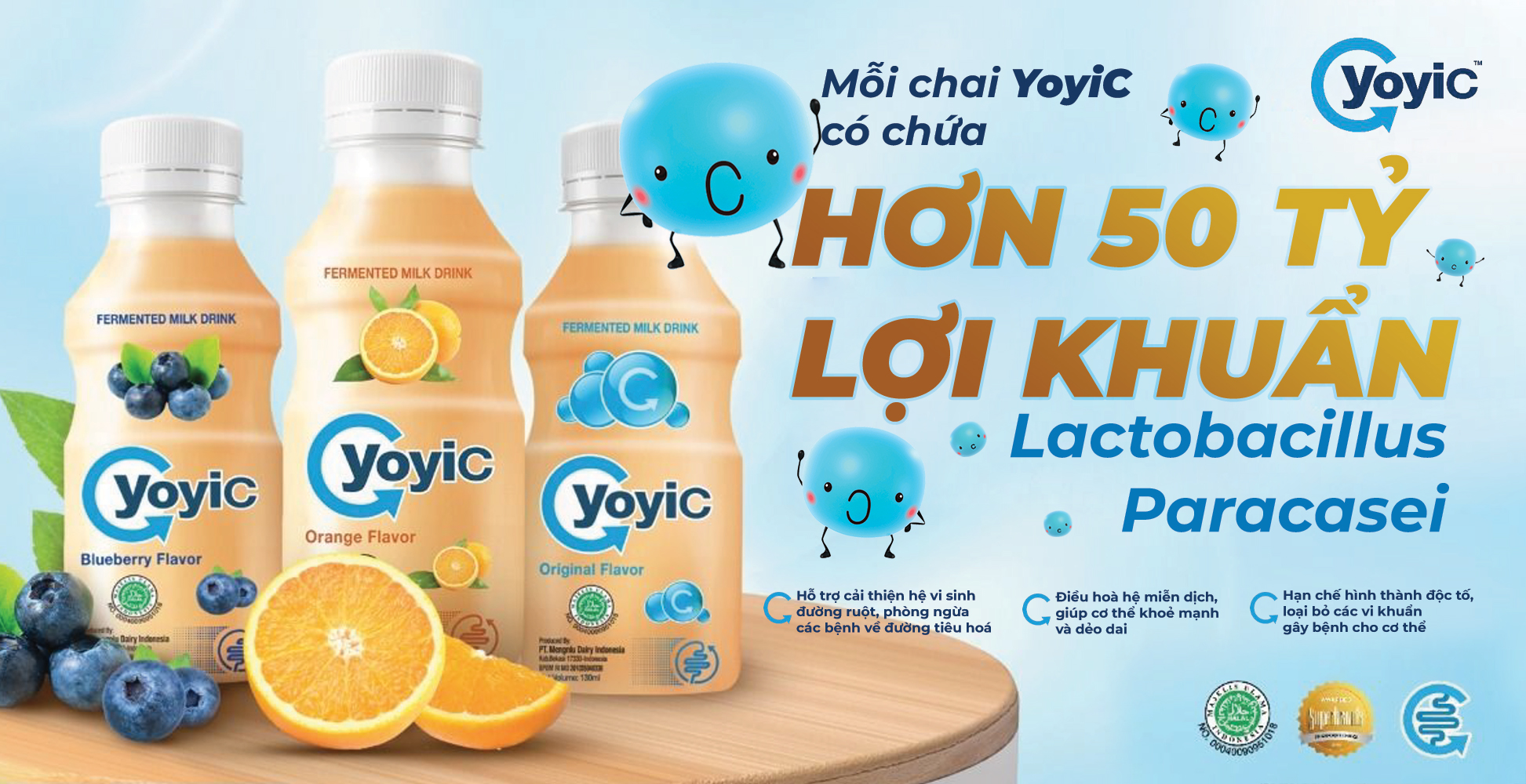 - Mỗi chai YoyiC có chứa hơn 50 tỷ lợi khuẩn Lactobacillus Paracasei, có khả năng di chuyển rộng trong hệ tiêu hóa mà vẫn sống sót.