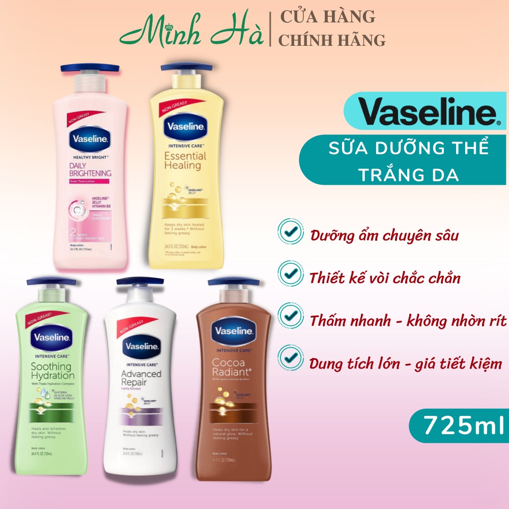 1. Sữa dưỡng thể Vaseline Healthy Bright Daily Brightening 725ml (Chai màu hồng): kết hợp giữa Vaseline Jelly và Vitamin B3 giúp tái tạo lại làn da trắng sáng, dưỡng ẩm da cao, bảo vệ làn da khỏi các tác nhân gây hại từ môi trường, dưỡng da chắc khỏe, hạn chế tình trạng da khô, xỉn màu, nứt nẻ. Chất kem màu trắng, mùi hương dịu nhẹ hơn so với phiên bản cũ. *** Lưu ý : đây là mẫu update của chai Vaseline bản Mỹ sản xuất Ấn Độ mà shop đang bán, mã vạch trùng luôn nhé mọi người. Mẫu mới này hãng đã thay đổi vòi xịt được làm to và dày dặn , khi vận chuyển xa sẽ không bị vỡ như bản cũ. Thành phần cơ bản là giống với bản cũ.