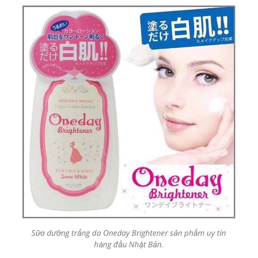 Sữa dưỡng trắng da cao cấp One Day Brightener Nhật Bản 120ml dùng cho Face và Body - Oneday Brightener là một sản phẩm chăm sóc da dạng lotion giúp che mờ các khuyết điểm tại nhiều vùng da trên cơ thể, như vết thâm, quầng mắt, đốm nâu, sạm, nám, tàn nhang, các vùng da sẫm màu như khuỷu tay, đầu gối, chân, cổ, vùng da dưới cánh tay, vùng bi-ki-ni, điều hòa màu da ở những vùng da bị mẩn đỏ do tác động của ánh nắng, đem đến cho bạn làn da trắng hồng tươi sáng, mịn màng, đều màu và dịu nhẹ cho những vùng da bị kích thích.