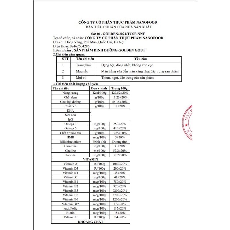 Sản phẩm này KHÔNG phải là thuốc, không có tác dụng thay thế thuốc chữa bệnh. 🔸 Sản phẩm sữa non Golden Gout là sự lựa chọn hoàn hảo cho những đối tượng: Người bị Gout. Người bị thiếu chất, cơ thể suy nhược do kiêng khem khi bị gout. Người gặp vấn đề về chức năng gan, thận. 📌📌 Lưu ý chỉ sử dụng sữa cho người từ 18 tuổi trở lên. ✅ HSD: 24 tháng 🔸 Thành phần chính của sữa non Golden Gout gồm: Sữa non; Kháng thể IgG; Chất xơ hòa tan; Omega 3,6; Canxi; 28 Vitamin & khoáng chất. * Vitamin và khoáng chất giúp bổ sung các dưỡng chất thiết yếu cho cơ thể, hỗ trợ tăng cường khả năng thải độc của gan, thận, tránh tình trạng rối loạn chuyển hóa ảnh hưởng tới quá trình đào thải acid uric. Từ đó giúp người bị Gout ăn ngon, ngủ ngon, giảm tình trạng mệt mỏi. Điều này rất quan trọng vì những người bị Gout thường phải ăn kiêng nên phải hạn chế lượng thực phẩm dung nạp vào cơ thể. * Canxi và Vitamin K1 tự nhiên giúp hệ xương chắc khỏe, giảm tần suất đau khớp do Gout hiệu quả. Dưỡng chất HMB trong sữa cũng giúp bảo vệ và tái tạo khối cơ, ngăn ngừa mất cơ do lão hóa. 👌 Với những thành phần và công dụng kể trên, sữa non Golden Gout chính là giải pháp dinh dưỡng đầy đủ và cân đối cho người bệnh Gout. 🔸 Công dụng: - Hỗ trợ duy trì nồng độ acid uric ở trạng thái ổn định: Hạ nồng độ acid uric, cải thiện chỉ số này trong cơ thể. - Giảm cơn đau do Gout gây ra. - Giảm thiểu tần suất xuất hiện cơn đau gout. - Hỗ trợ tăng cường sức đề kháng cho người cao tuổi, giảm tình trạng uể oải, ốm vặt. - Giúp vận động, đi lại linh hoạt, dễ dàng hơn. - Cải thiện chức năng tim, gan, thận. - Đánh bay nỗi lo lắng trên bệnh nhân gout: Đau nhức thường xuyên, cơ thể mệt mỏi, ăn uống trở nên khó khăn, khó ngủ, trằn trọc về đêm (Gout đau về đêm). - Bổ sung chất dinh dưỡng với hàm lượng purin thấp khi người bị gout phải kiêng khem, chế độ ăn nghèo nàn. 🔸 Hướng dẫn sử dụng B1: Pha 5 muỗng gạt miệng, tương đương với 50g bột (sử dụng thìa của nhà sản xuất) cùng với 200ml nước sôi (40 – 60°C) . B2: Khuấy đều cho bột tan hết và sử dụng ngay. Dùng 2 ly mỗi ngày. 📌📌📌 Lưu ý khi dùng sữa non Golden Gout - Cần kết hợp chế độ ăn ít béo no và ít cholesterol. - Hạn chế tiêu thụ thực phẩm giàu đạm, chứa nhân purin: Thịt đỏ, hải sản. - Viện Dinh dưỡng Quốc gia Việt Nam khuyến nghị nên sử dụng 2 – 3 ly Golden Gout mỗi ngày, nhằm đáp ứng nhu cầu Canxi, dinh dưỡng theo cơ địa của người Việt. - Trong quá trình pha, không nên sử dụng nước quá nóng gây phá hủy dưỡng chất thiết yếu có trong sữa hay nước nguội sẽ khiến sữa khó tan, uống không ngon. - Sau khi pha xong nên uống ngay, uống hết để đủ lượng và tránh lãng phí.