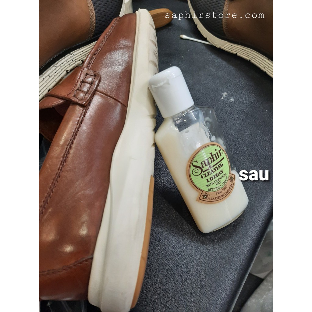 MÔ TẢ VÀ CÔNG DỤNG: - Sữa làm sạch và đánh bóng Saphir (Clean Lotion Saphir) làm sạch và làm sáng da trơn và da nubuck dầu. Kem Saphir cleaning lotion hiệu quả hơn kem Saphir creme universelle, nhưng ít mạnh hơn kem Cleaner Renomat Saphir, và loại bỏ bụi bẩn và dư thừa của lớp sáp trong khi bảo quản lớp patina và lớp bóng. Công thức của nó giàu sáp carnauba giúp bảo vệ và tăng độ bóng. - Phù hợp cho giày dép, quần áo, đồ da, đồ nội thất, hành lý, vv làm bằng da trơn, da nubuck dầu, da tổng hợp, skai, cao su hoặc vải tráng.