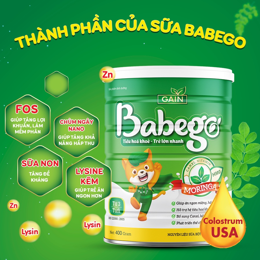 Babego là dòng sữa công thức đầu tiên bổ sung bột Chùm ngây (Moringa) chiết xuất theo công nghệ Nano kết hợp với các thành phần sữa nhập khẩu trực tiếp tại New Zealand cải thiện chứng chậm tăng cân, biếng ăn, suy dinh dưỡng. Sữa kích thích trẻ thèm ăn, hấp thu tốt và tăng cân đều, ngoài ra còn giúp trẻ kích thích hệ tiêu hoá, ngừa táo bón, tăng cường hệ miễn dịch