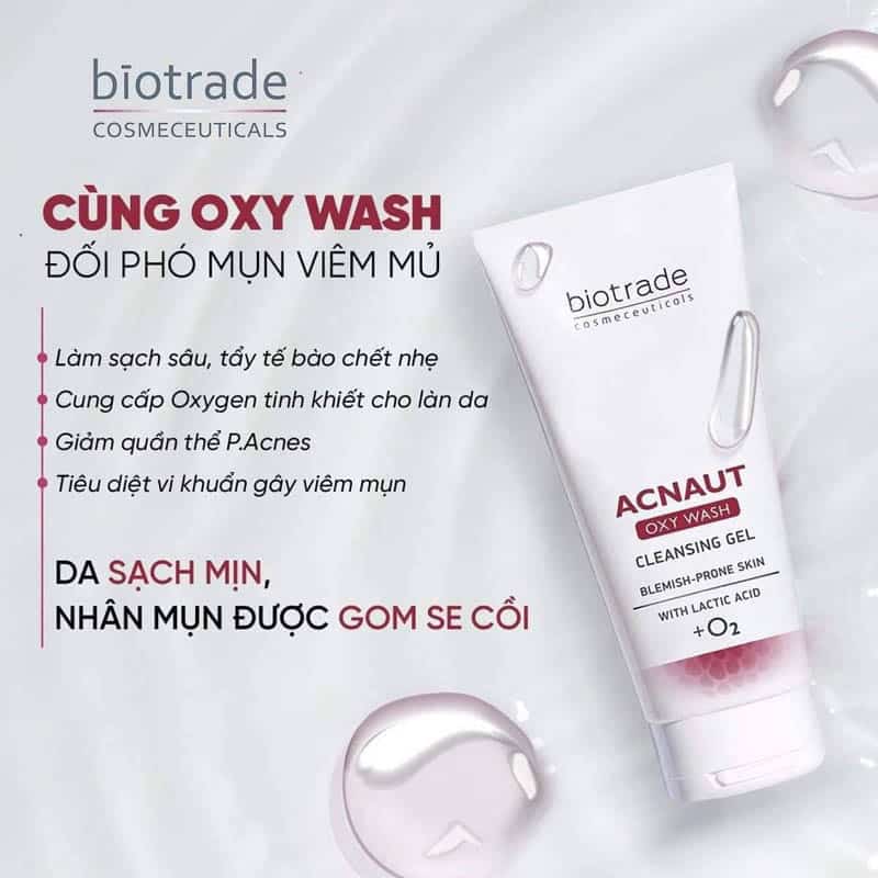 Sữa rửa mặt cho da mụn viêm dạng gel Biotrade Acnaut Oxy Wash Cleansing GelNếu da bạn đang bị mụn trứng cá viêm thì sữa rửa mặt Acnaut Oxy Wash là lựa chọn đầu tiên với các hoạt chất hoàn toàn tự nhi...