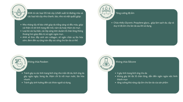 Thành phần: Water, Sodium Laureth Sulfate, Cocamidopropyl Betaine, Cocamide DEA, Fragrance, Glycerin, Sodium Chloride, Hydroxyethyl Urea, PEG-7 Glyceryl Cocoate, Polyquaternium-7, Phenoxyethanol, Decyl Glucoside, DMDM Hydantoin, Sodium Lauroyl Lactylate, Tetrasodium EDTA, Benzophenone-4, Citric Acid, Prunus Serrulata Flower Extract, Eucalyptus Globulus Leaf Extract, Mentha Viridis (Spearmint) Leaf Extract, Propylene Glycol, Lactic acid, Glycolic acid, Tartaric acid, Malic acid, Pyrus malus (Apple) Juice, Vitis vinifera (Grape) Leaf Extract, Vaccinium myrtillus Leaf Extract, Citrus Limon (Lemon) Fruit Extract, Saccharum officinarum (Sugar cane) Extract, 1,2-Hexanediol, Sodium Benzoate, Potassium Sorbate , CI 19140, CI 42090.