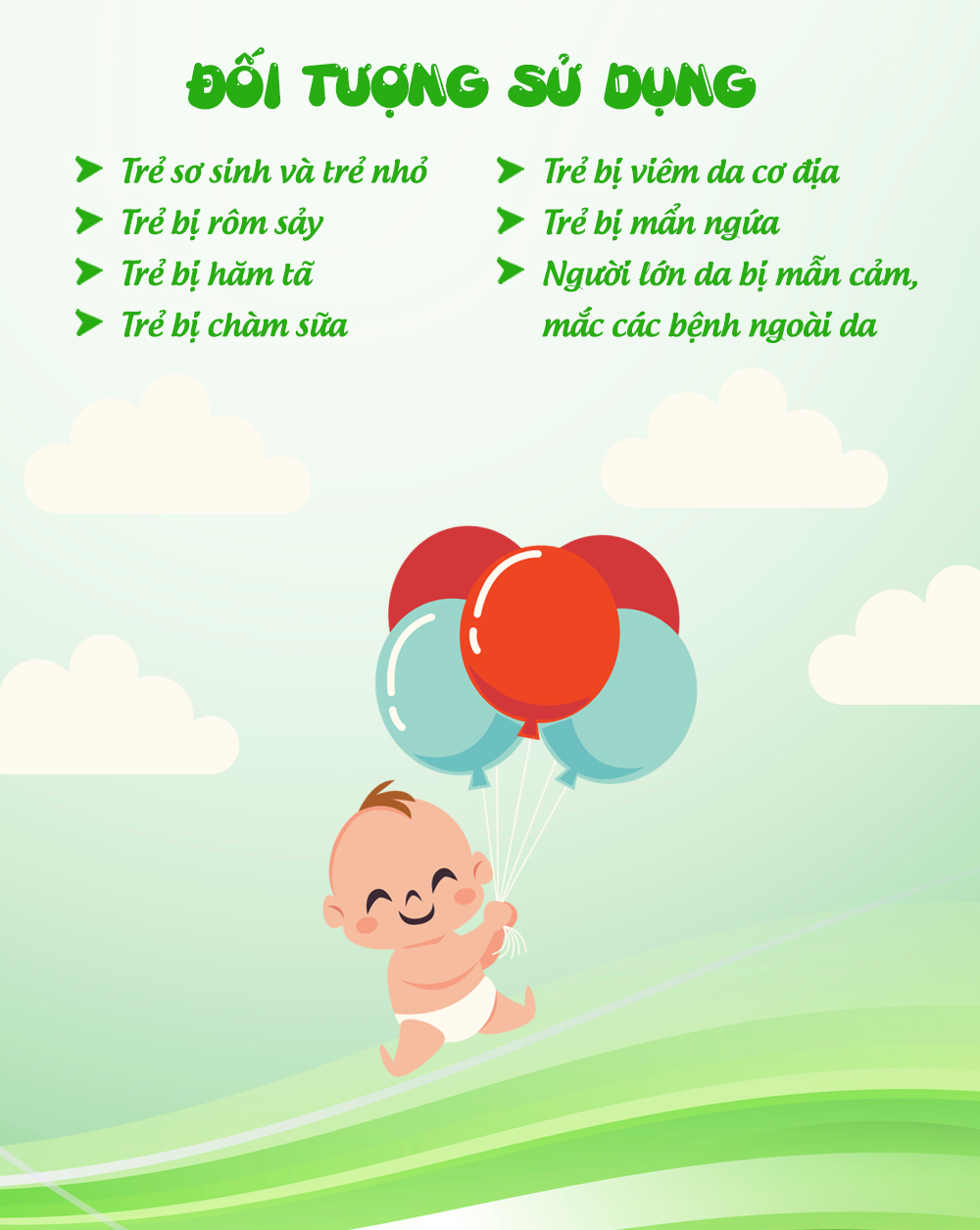 - Dùng để phòng ngừa - đối với trẻ sơ sinh và trẻ nhỏ tắm gội hằng ngày để bảo vệ da trước các bệnh lý về da như: viêm da, hăm da, lông măng, mẩn ngứa, kê sữa. Dùng từ 5ml-10ml, có thể dùng xoa trực tiếp cho bé hoặc pha vào nước rồi tắm cho bé với tỉ lệ 3-4l nước ấm; nên sử dụng hằng ngày để làn da của bé được bảo vệ tốt nhất.