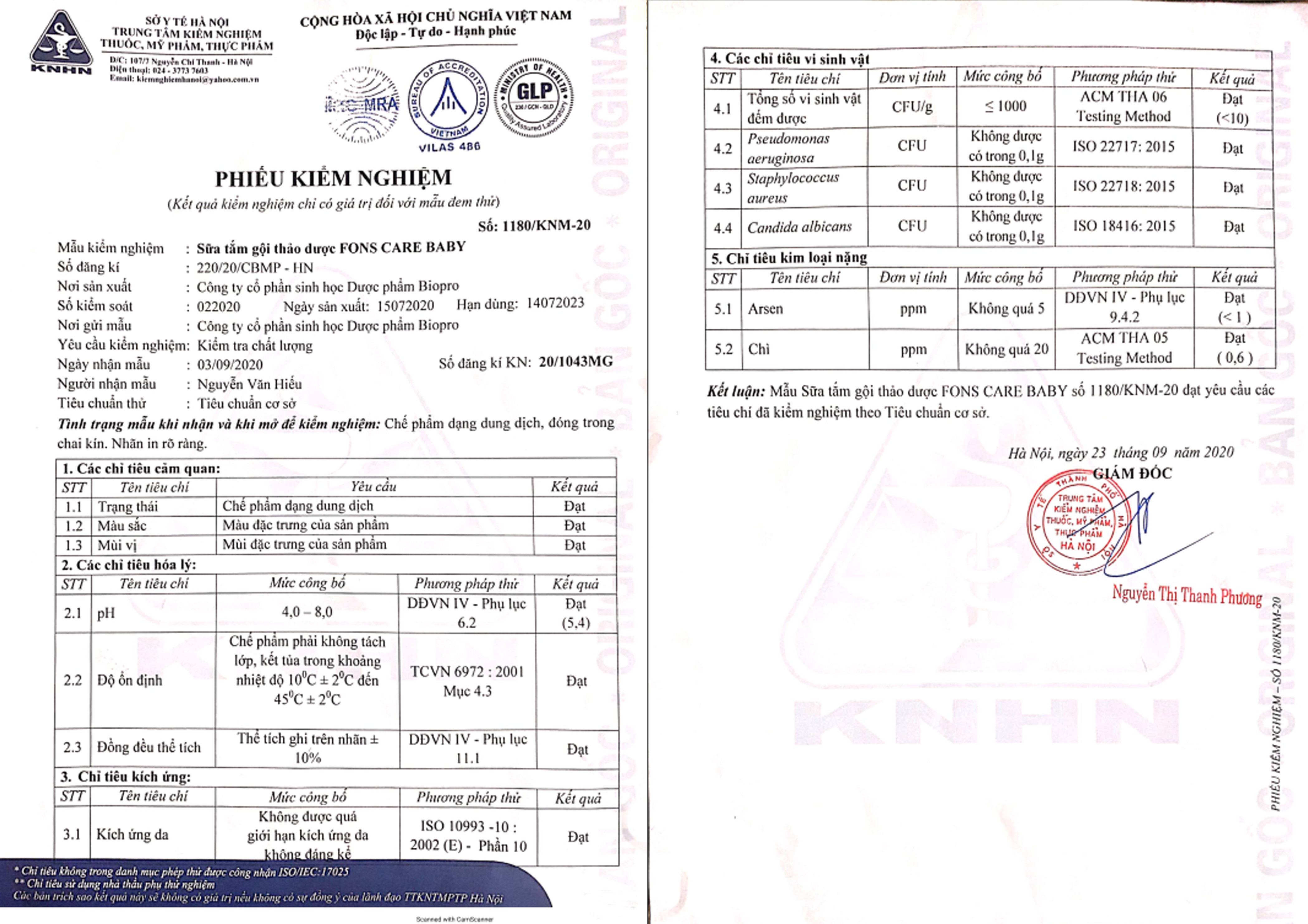 Phiếu kiểm nghiệm sản phẩm của Sở y tế Hà Nội