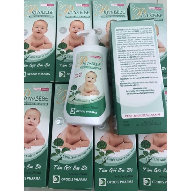 PHYTOBEBE là dung dịch tắm rôm sảy em bé hằng ngày với thành phần chiết xuất từ thảo dược . PHYTOBEBE có tác dụng kháng khuẩn và kháng nấm gây bệnh, nhẹ nhàng chăm sóc và bảo vệ da cho bé.PHYTOBEBE được dùng để: Tắm, gội, vệ sinh thân thể cho em bé hằng ngày. Phòng ngừa và hỗ trợ điều trị các bệnh ngoài da ở trẻ em như: rôm sảy, chốc đầu, ghẻ ngứa, hăm da, viêm da. Cho chai 100ml Cao trầu không (Extract Piper betle) 0,04g Cao hạt ngò (mùi, Extract Coriandrum) 0,10g Alpha – Terpineol thiên nhiên 1g (chiết xuất Tinh dầu tràm) Vitamin E, B5, thành phần dưỡng da, dưỡng tóc, và tá dược vừa đủ 100ml Chai 250ml chú ý: sản phẩm này không phải là thuốc và không có tác dụng thay thế thuốc chữa bệnh #phytobebe #tắm #rôm #250ml #lớn #vòi #phyto #bé #