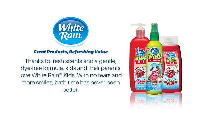 - Với công thức không cay mắt cho bé cảm giác vô cùng thích thú khi tắm. White rain kids có nhiều thành phần dưỡng ẩm, chống xơ rối cho tóc, làm sạch mồ hôi trên cơ thể từ đầu đén chân mà không gây kích ứng da. Sản phẩm đã được chứng minh và kiểm nghiệm nghiêm ngặt trên động vật