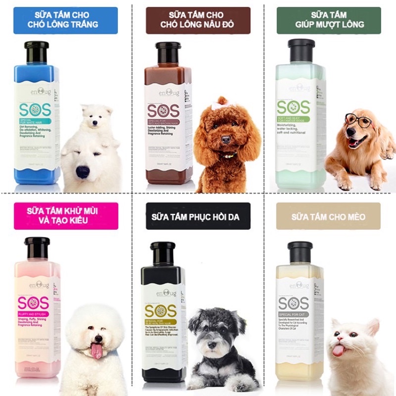 Với mỗi dòng khác nhau, SOS có thêm các tính chất riêng biệt: - SOS HỒNG: giúp lông sáng hơn, siêu mềm mượt, và lưu giữ hương thơm lâu hơn. - SOS XANH LÁ: dành cho pet có bộ lông bị khô, xơ, giữ độ ẩm cho da. - SOS XANH DƯƠNG: dành cho pet lông trắng, giúp màu lông không bị ngả sang vàng. - SOS NÂU: dành cho pet lông màu, giúp bóng lông, không bị phai màu. - SOS ĐEN: phục hồi da và lông, ngăn ngừa viêm da và có tác dụng diệt ve nấm, bọ chét. - SOS TRẮNG: dành riêng cho mèo.